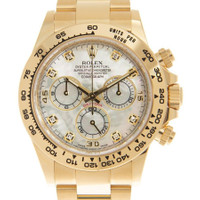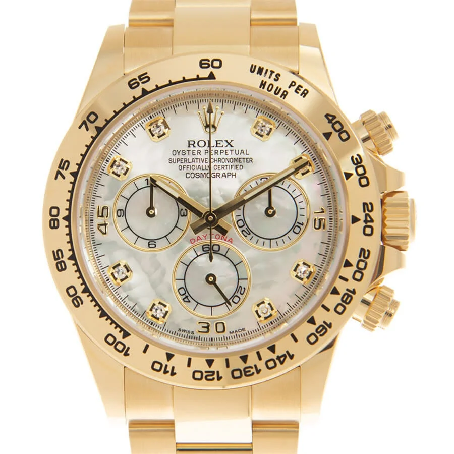 Yellow gold-tone 18kt yellow gold case with a yellow gold-tone 18kt yellow gold rolex oyster bracelet. Fixed tachymeter scale yellow gold-tone 18kt yellow gold bezel. White mother of pearl dial with yellow gold-tone hands and diamonds hour markers. Tachymetric scale. Dial Type: Analog. Luminescent hands. Chronograph - three sub-dials displaying: 60 second, 30 minute and 12 hour. Rolex Calibre 4130 Automatic movement, based upon Rolex 4030, containing 44 Jewels, bitting at 28800 vph, and has a power reserve of approximately 72 hours. Scratch resistant sapphire crystal. Screw down crown. Solid case back. Round case shape, case size: 40 mm. Fold over clasp. Water resistant at 100 meters / 330 feet. Functions: chronograph, hour, minute, second. Cosmograph Daytona Series. Luxury watch style. Watch label: Swiss Made. Rolex Cosmograph Daytona Chronograph Automatic Diamond White Mother of Pearl Dial Men's Watch 116508WMDO. CASE Case Size: 40 Case Material: 18kt Yellow Gold Case Shape: Round Case Back: Solid BAND Band Material: 18kt Yellow Gold Rolex Oyster Band Type: Bracelet Band Color: Yellow Gold-tone Clasp: Fold Over DIAL Dial Color: White Mother of Pearl Type: Analog Crystal: Scratch Resistant Sapphire Hands: Yellow Gold-tone Dial Markers: Diamonds Second Markers: Tachymetric Scale Sub Dials: Three - 60 Second, 30 Minute and 12 Hour Luminiscence: Hands Bezel: Fixed Tachymeter Scale Bezel Color: Yellow Gold-tone Bezel Material: 18kt Yellow Gold Crown: Screw Down INFORMATION Brand: Rolex Series: Cosmograph Daytona Collection Name: Cosmograph Daytona Gender: Mens Model: 116508WMDO Watch Label: Swiss Made Movement: Automatic Engine: Rolex Calibre 4130 Power Reserve: 72 hours FEATURES Water Resistance: 100 meters / 330 feet Functions: Chronograph, Hour, Minute, Second Watch Features: Diamond, Chronograph, Gold, Analog ADDITIONAL INFO Watch Style: Luxury Warranty: 2 Year Jomashop Warranty Jomashop Sku: RLX116508WMDO Department: Watches Category: Watches