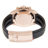 18kt everose gold case with a black oysterflex band. Fixed tachymeter scale 18kt everose gold and ceramic bezel. Ivory dial with index hour markers. Minute markers around the outer rim. Dial Type: Analog. Luminescent hands and markers. Chronograph - three sub-dials displaying: 60 second, 30 minute and 1/10th of a second. Rolex Calibre 4130 automatic movement with a 72-hour power reserve. Scratch resistant sapphire crystal. Screw down crown. Solid case back. Round case shape. Case size: 40 mm. Oyster deployment clasp. Water resistant at 100 meters / 330 feet. Functions: chronograph, hour, minute, second. Luxury watch style. Watch label: Swiss Made. CASE Case Size: 40 Case Material: 18kt Everose Gold Case Shape: Round Case Back: Solid BAND Band Material: Oysterflex Band Type: Strap Band Color: Black Clasp: Oyster Deployment DIAL Dial Color: Ivory Type: Analog Crystal: Scratch Resistant Sapphire Dial Markers: Index Second Markers: Minute Markers around the outer rim Sub Dials: Three - 60 Second, 30 Minute and 1/10th of a Second Luminiscence: Hands and Markers Bezel: Fixed Tachymeter Scale Bezel Material: 18kt Everose Gold and Ceramic Crown: Screw Down INFORMATION Brand: Rolex Series: Cosmograph Daytona Collection Name: Cosmograph Daytona Gender: Mens Model: 116515 ln-0041 Watch Label: Swiss Made Movement: Automatic Engine: Rolex Calibre 4130 Power Reserve: 72 hours FEATURES Water Resistance: 100 meters / 330 feet Functions: Chronograph, Hour, Minute, Second Watch Features: Chronograph, Gold, Ceramic, Analog ADDITIONAL INFO Watch Style: Luxury Warranty: 2 Year Jomashop Warranty Jomashop Sku: RLX116515IVSR Item Variation: M116515LN-0019 Department: Watches Category: Watches
