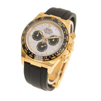 Yellow gold-tone 18kt yellow gold case with a black rubber strap. Fixed tachymeter scale black cerachrom bezel. Meteorite dial with yellow gold-tone hands and index hour markers. Minute markers around the outer rim. Dial Type: Analog. Luminescent hands and markers. Chronograph - three sub-dials displaying: 60 second, 30 minute and 12 hour. Rolex Calibre 4131 Automatic movement, based upon Rolex Calibre 4130, containing 47 Jewels, bitting at 28800 vph, and has a power reserve of approximately 72 hours. Scratch resistant sapphire crystal. Screw down crown. Solid case back. Round case shape, case size: 40 mm. Fold over clasp with a safety release. Water resistant at 100 meters / 330 feet. Functions: chronograph, hour, minute, small second, chronometer. Cosmograph Daytona Series. Luxury watch style. Watch label: Swiss Made. Rolex Cosmograph Daytona Chronograph Automatic Chronometer Men's Watch m126518ln-0016. GENERAL Box Type: Original Box CASE Case Diameter: 40 mm Case Material: 18kt Yellow Gold Case Shape: Round Case Back: Solid BAND Band Material: Rubber Band Type: Strap Band Color: Black Clasp: Fold Over with Safety Release DIAL Dial Color: Meteorite Type: Analog Crystal: Scratch Resistant Sapphire Hands: Yellow Gold-tone Dial Markers: Index Second Markers: Minute Markers around the outer rim Sub Dials: Three - 60 Second, 30 Minute and 12 Hour Luminiscence: Hands and Markers Bezel: Fixed Tachymeter Scale Bezel Color: Black Bezel Material: Cerachrom Crown: Screw Down INFORMATION Brand: Rolex Series: Cosmograph Daytona Collection Name: Cosmograph Daytona Gender: Mens Model: m126518ln-0016 Watch Label: Swiss Made Movement: Automatic Engine: Rolex Calibre 4131 Power Reserve: 72 hours FEATURES Water Resistance: 100 meters / 330 feet Functions: Chronograph, Hour, Minute, Small Second, Chronometer Watch Features: Analog, Chronometer, Gold, Rubber, Chronograph ADDITIONAL INFO Watch Style: Luxury Warranty: 2 Year Jomashop Warranty Jomashop Sku: RLXM126518LN0016 Department: Watches
