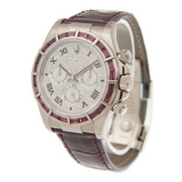 18kt white gold case with a red leather strap. Fixed tachymeter scale red ruby diamond set bezel. White dial with white hands and Roman numeral hour markers. Minute markers around the outer rim. Dial Type: Analog. Luminescent hands. Rolex Calibre 4130 Automatic movement, based upon Rolex 4030, containing 44 Jewels, bitting at 28800 vph, and has a power reserve of approximately 72 hours. Scratch resistant sapphire crystal. Screw down crown. Solid case back. Round case shape. Case size: 40 mm. Tang clasp. Water resistant at 100 meters / 330 feet. Functions: chronograph, hour, minute, second, chronometer. Luxury watch style. Watch label: Swiss Made. Rolex Cosmograph Daytona Chronograph Red Ruby Automatic Chronometer Diamond Men's Watch 116589 SALV. CASE Case Size: 40 Case Material: 18kt White Gold Case Shape: Round Case Back: Solid BAND Band Material: Leather Band Type: Strap Band Color: Red Clasp: Tang DIAL Dial Color: White Type: Analog Crystal: Scratch Resistant Sapphire Hands: White Dial Markers: Roman Numeral Second Markers: Minute Markers around the outer rim Luminiscence: Hands Bezel: Fixed Tachymeter Scale Bezel Color: Red Ruby Bezel Material: Diamond Set Crown: Screw Down INFORMATION Brand: Rolex Series: Cosmograph Daytona Collection Name: Cosmograph Daytona Gender: Mens Model: 116589 SALV Watch Label: Swiss Made Movement: Automatic Engine: Rolex Calibre 4130 Power Reserve: 72 hours FEATURES Water Resistance: 100 meters / 330 feet Functions: Chronograph, Hour, Minute, Second, Chronometer Watch Features: Analog, Chronometer, Gold, Leather, Chronograph, Diamond ADDITIONAL INFO Watch Style: Luxury Warranty: 2 Year Jomashop Warranty Jomashop Sku: RLX116589SARDL Department: Watches Category: Watches