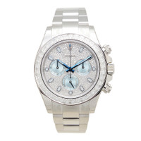 950 platinum case with a 950 platinum bracelet. Set with 36 baguette-cut diamonds bezel. Diamond pave dial with blue-toned hands and index hour markers. Minute markers around the outer rim. Dial Type: Analog. Luminescent hands and markers. Chronograph - three sub-dials displaying: 60 second, 30 minute and 12 hour. Automatic movement. Scratch resistant sapphire crystal. Screw down crown. Solid case back. Case diameter: 40 mm. Round case shape. Folding oysterlock clasp. Water resistant at 100 meters / 330 feet. Functions: chronograph, hour, minute, second. Luxury watch style. Watch label: Swiss Made. Rolex Cosmograph Daytona Diamond Pave Dial Platinum Men's Watch 116576TBR. CASE Case Size: 40 Case Material: 950 Platinum Case Shape: Round Case Back: Solid BAND Band Material: 950 Platinum Band Type: Bracelet Band Color: White Clasp: Fold Over Oysterlock DIAL Dial Color: Diamond Pave Type: Analog Crystal: Scratch Resistant Sapphire Hands: Blue-toned Dial Markers: Index Second Markers: Minute Markers around the outer rim Sub Dials: Three - 60 Second, 30 Minute and 12 Hour Luminiscence: Hands and Markers Bezel: Fixed Bezel Color: 950 Platinum Bezel Material: 36 Baguette-cut Diamond Set Crown: Screw Down INFORMATION Brand: Rolex Series: Cosmograph Daytona Collection Name: Cosmograph Daytona Gender: Mens Model: 116576TBR Watch Label: Swiss Made Movement: Automatic Engine: Rolex Calibre 4130 Power Reserve: 72 hours FEATURES Water Resistance: 100 meters / 330 feet Functions: Chronograph, Hour, Minute, Second, Chronometer Watch Features: Analog, Diamond, Chronograph, Chronometer, Platinum ADDITIONAL INFO Watch Style: Luxury Warranty: 2 Year Jomashop Warranty UPC Code: 845960076074 Jomashop Sku: RLX116576TBR Item Variation: M116576TBR-0005 Department: Watches Category: Watches