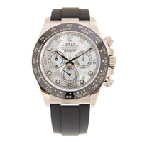 18kt white gold case with a black oysterflex band. Black monobloc cerachrom ceramic bezel. Mother of pearl dial with silver-tone hands and diamond hour markers. Tachymeter. Dial Type: Analog. Chronograph - three sub-dials displaying: 60 second, 30 minute and 12 hours. Rolex Calibre 4130 automatic movement with a 72-hour power reserve. Scratch resistant sapphire crystal. Screw down crown. Solid case back. Round case shape. Case size: 40 mm. Water resistant at 100 meters / 330 feet. Functions: chronograph, hour, minute, second. Luxury watch style. Watch label: Swiss Made. Item Variations: 116519LN. Rolex Cosmograph Daytona Mother of Pearl Diamond Dial Men's Chronograph Oysterflex Watch 116519MDR. CASE Case Size: 40 Case Material: 18kt White Gold Case Shape: Round Case Back: Solid BAND Band Material: Oysterflex Band Type: Strap Band Color: Black Clasp: Oysterlock DIAL Dial Color: Mother of Pearl Type: Analog Crystal: Scratch Resistant Sapphire Hands: Silver-tone Dial Markers: Diamond Second Markers: Tachymeter Sub Dials: Three - 60 Second, 30 Minute and 12 Hour Bezel: Fixed Tachymeter Scale Bezel Color: Black Bezel Material: Monobloc Cerachrom Crown: Screw Down INFORMATION Brand: Rolex Series: Cosmograph Daytona Collection Name: Cosmograph Daytona Gender: Mens Model: 116519MDR Watch Label: Swiss Made Movement: Automatic Engine: Rolex Calibre 4130 Power Reserve: 72 hours FEATURES Water Resistance: 100 meters / 330 feet Functions: Chronograph, Hour, Minute, Second Watch Features: Diamond, Chronograph, Gold, Ceramic, Analog ADDITIONAL INFO Watch Style: Luxury Warranty: 2 Year Jomashop Warranty Jomashop Sku: RLX116519MDR Item Variation: 116519LN Department: Watches Category: Watches