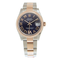 Silver-tone stainless steel case with a two-tone (silver-tone and rose gold-tone) stainless steel and 18kt everose gold oyster bracelet. Domed rose gold-tone 18kt everose gold bezel. Aubergine dial with everose gold hands and Roman- diamond numeral hour markers. Dial Type: Analog. Date display at the 3 o'clock position. Rolex Calibre 2236 Automatic movement, based upon Rolex 2235, containing 31 Jewels, bitting at 28800 vph, and has a power reserve of approximately 55 hours. Scratch resistant sapphire crystal. Screw down crown. Solid case back. Round case shape, case size: 31 mm. Folding clasp. Water resistant at 100 meters / 330 feet. Functions: date, hour, minute, second. Datejust 31 Series. Luxury watch style. Watch label: Swiss Made. Rolex Datejust 31 Aubergine Dial Automatic Ladies Steel and 18kt Everose Gold Oyster Watch 278241AURDO. INFORMATION Brand: Rolex Series: Datejust Collection Name: Datejust Gender: Womens Model: 278241AURDO Watch Label: Swiss Made Movement: Automatic Engine: Rolex Calibre 2236 CASE Case Size: 31 mm Case Material: Stainless Steel Case Shape: Round Case Back: Solid BAND Band Material: Stainless Steel and 18kt Everose Gold Oyster Band Type: Bracelet Band Color: Two-tone (Silver-tone and Rose Gold-tone) Clasp: Folding DIAL Dial Color: Aubergine Type: Analog Crystal: Scratch Resistant Sapphire Hands: Everose Gold Dial Markers: Roman- Diamond Numeral Bezel: Domed Bezel Color: Rose Gold-tone Bezel Material: 18kt Everose Gold Crown: Screw Down FEATURES Water Resistance: 100 meters / 330 feet Calendar: Date display at the 3 o'clock position Functions: Date, Hour, Minute, Second Watch Features: Diamond, Stainless Steel, Gold, Analog ADDITIONAL INFO Watch Style: Luxury Warranty: 2 Year Jomashop Warranty Jomashop Sku: RLX278241AURDO Department: Watches Category: Watches