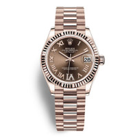 18kt everose gold case with a 18kt everose gold president bracelet. Fixed fluted 18kt everose gold bezel. Chocolate dial with everose gold hands and Roman numeral hour markers. Diamond-set roman numeral appears at the 6 o'clock position. Dial Type: Analog. Date display at the 3 o'clock position. Rolex Calibre 2236 Automatic movement, based upon Rolex 2235, containing 31 Jewels, bitting at 28800 vph, and has a power reserve of approximately 55 hours. Scratch resistant sapphire crystal. Screw down crown. Solid case back. Round case shape, case size: 31 mm. Crown clasp. Water resistant at 100 meters / 330 feet. Functions: date, hour, minute, second, chronometer. Datejust 31 Series. Luxury watch style. Watch label: Swiss Made. Item Variations: M278275-0025. Rolex Datejust 31 Automatic 18kt Everose Gold Diamond Chocolate Dial Ladies Watch 278275-0025. INFORMATION Brand: Rolex Series: Datejust Collection Name: Datejust Gender: Womens Model: 278275-0025 Watch Label: Swiss Made Movement: Automatic Engine: Rolex Calibre 2236 Power Reserve: 55 hours CASE Case Size: 31 mm Case Material: 18kt Everose Gold Case Shape: Round Case Back: Solid BAND Band Material: 18kt Everose Gold President Band Type: Bracelet Clasp: Crownclasp DIAL Dial Color: Chocolate Type: Analog Crystal: Scratch Resistant Sapphire Hands: Everose Gold Dial Markers: Roman Numeral Second Markers: Diamond-set Roman Numeral appears at the 6 o'clock position Bezel: Fixed Fluted Bezel Material: 18kt Everose Gold Crown: Screw Down FEATURES Water Resistance: 100 meters / 330 feet Calendar: Date display at the 3 o'clock position Functions: Date, Hour, Minute, Second, Chronometer Watch Features: Diamond, Gold, Chronometer, Analog ADDITIONAL INFO Watch Style: Luxury Warranty: 2 Year Jomashop Warranty Jomashop Sku: RLX278275CHRDJ Item Variation: M278275-0025 Department: Watches Category: Watches