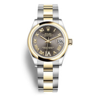 Stainless steel and 18kt yellow gold case with a steel and 18kt yellow gold oyster bracelet. Fixed 18kt yellow gold bezel. Dark grey dial with gold-tone hands and Roman-diamond hour markers. Dial Type: Analog. Date display at the 3 o'clock position. Rolex Calibre 2236 Automatic movement, based upon Rolex 2235, containing 31 Jewels, bitting at 28800 vph, and has a power reserve of approximately 55 hours. Scratch resistant sapphire crystal. Screw down crown. Solid case back. Round case shape. Case size: 31 mm. Folding clasp. Water resistant at 100 meters / 330 feet. Functions: date, hour, minute, second. Luxury watch style. Watch label: Swiss Made. Rolex Datejust 31 Automatic Dark Grey Dial Ladies Oyster Watch 278243GYRDO. INFORMATION Brand: Rolex Series: Datejust Collection Name: Datejust Gender: Womens Model: 278243GYRDO Watch Label: Swiss Made Movement: Automatic Engine: Rolex Calibre 2236 Power Reserve: 55 hours CASE Case Size: 31 mm Case Material: Stainless Steel and 18kt Yellow Gold Case Shape: Round Case Back: Solid BAND Band Material: Steel and 18kt Yellow Gold Oyster Band Type: Bracelet Clasp: Folding DIAL Dial Color: Dark Grey Type: Analog Crystal: Scratch Resistant Sapphire Hands: Gold-tone Dial Markers: Roman-Diamond Bezel: Fixed Bezel Material: 18kt Yellow Gold Crown: Screw Down FEATURES Water Resistance: 100 meters / 330 feet Calendar: Date display at the 3 o'clock position Functions: Date, Hour, Minute, Second Watch Features: Diamond, Stainless Steel, Gold, Analog ADDITIONAL INFO Watch Style: Luxury Warranty: 2 Year Jomashop Warranty Jomashop Sku: RLX278243GYRDO Department: Watches Category: Watches