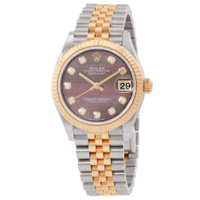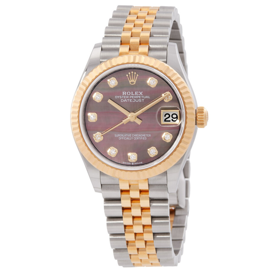 Stainless steel & 18k yellow gold case with a brushed & polished stainless steel & 18k yellow gold jubilee bracelet. Fixed fluted 18k yellow gold bezel. Black mother of pearl dial with gold-tone hands and diamond hour markers. Dial Type: Analog. Date display at the 3 o'clock position. Rolex Calibre 2236 Automatic movement, based upon Rolex 2235, containing 31 Jewels, bitting at 28800 vph, and has a power reserve of approximately 55 hours. Scratch resistant sapphire crystal. Screw down crown. Solid case back. Round case shape, case size: 31 mm. Rolex concealed folding crown clasp. Water resistant at 100 meters / 330 feet. Functions: date, hour, minute, second. Datejust Series. Dress watch style. Watch label: Swiss Made. Rolex Datejust 31 Automatic Diamond Black Mother Of Pearl Dial Ladies Watch 278273BKDJ. GENERAL Box Type: Original Box CASE Case Material: Stainless Steel & 18k Yellow Gold Case Shape: Round Case Back: Solid BAND Band Material: Stainless Steel & 18k Yellow Gold Jubilee Band Type: Bracelet Band Color: Brushed & Polished Clasp: Rolex Concealed Folding Crownclasp DIAL Dial Color: Black Mother of Pearl Type: Analog Crystal: Scratch Resistant Sapphire Hands: Gold-tone Dial Markers: Diamond Bezel: Fixed Fluted Bezel Material: 18k Yellow Gold Crown: Screw Down INFORMATION Brand: Rolex Series: Datejust Collection Name: Datejust Gender: Womens Model: 278273BKDJ Watch Label: Swiss Made Movement: Automatic Engine: Rolex Calibre 2236 Power Reserve: 55 hours FEATURES Water Resistance: 100 meters / 330 feet Calendar: Date display at the 3 o'clock position Functions: Date, Hour, Minute, Second Watch Features: Analog, Gold, Stainless Steel, Diamond ADDITIONAL INFO Watch Style: Dress Warranty: 2 Year Jomashop Warranty Jomashop Sku: RLX278273BKDJ Department: Watches Category: Watches