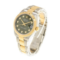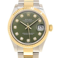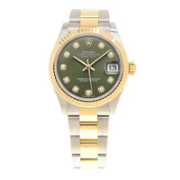 Stainless steel & 18k yellow gold case with a brushed & polished stainless steel & 18k yellow gold oyster bracelet. Fixed fluted 18k yellow gold bezel. Green dial with gold-tone hands and diamond hour markers. Dial Type: Analog. Date display at the 3 o'clock position. Caliber 2236 automatic movement with a 55-hour power reserve. Scratch resistant sapphire crystal. Screw down crown. Solid case back. Round case shape, case size: 31 mm. Rolex folding oyster clasp. Water resistant at 100 meters / 330 feet. Functions: date, hour, minute, second. Datejust Series. Dress watch style. Watch label: Swiss Made. Item Variations: M278273-0029. Rolex Datejust 31 Automatic Diamond Green Dial Ladies Watch 278273GNDO. CASE Case Size: 31 Case Material: Stainless Steel & 18k Yellow Gold Case Shape: Round Case Back: Solid BAND Band Material: Stainless Steel & 18k Yellow Gold Oyster Band Type: Bracelet Band Color: Brushed & Polished Clasp: Rolex Folding Oysterclasp DIAL Dial Color: Green Type: Analog Crystal: Scratch Resistant Sapphire Hands: Gold-tone Dial Markers: Diamond Bezel: Fixed Fluted Bezel Material: 18k Yellow Gold Crown: Screw Down INFORMATION Brand: Rolex Series: Datejust Collection Name: Datejust Gender: Womens Model: 278273GNDO Watch Label: Swiss Made Movement: Automatic Engine: Caliber 2236 Power Reserve: 55 hours FEATURES Water Resistance: 100 meters / 330 feet Calendar: Date display at the 3 o'clock position Functions: Date, Hour, Minute, Second Watch Features: Analog, Gold, Stainless Steel, Diamond ADDITIONAL INFO Watch Style: Dress Warranty: 2 Year Jomashop Warranty Jomashop Sku: RLX278273GNDO Item Variation: M278273-0029 Department: Watches Category: Watches