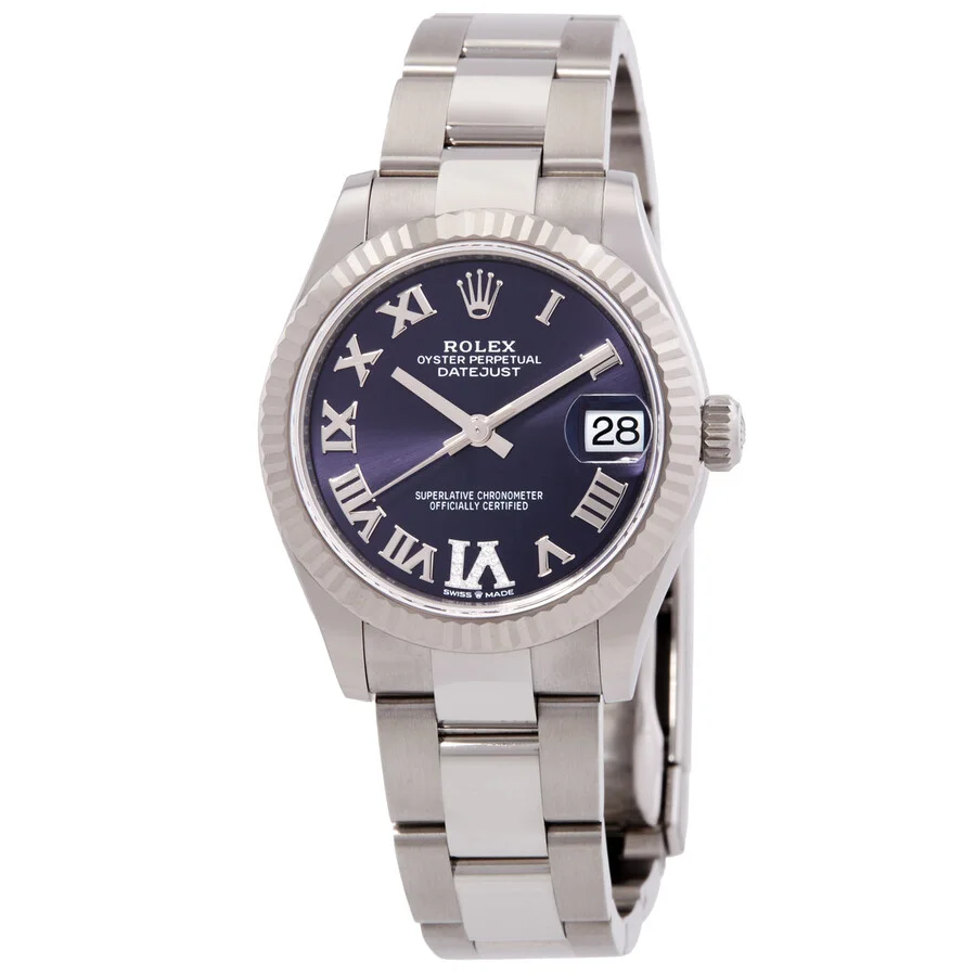Silver-tone stainless steel/18k white gold case with a silver-tone stainless steel rolex oyster bracelet. Silver-tone stainless steel bezel. Aubergine dial with silver-tone hands and Roman- diamond numeral hour markers. Dial Type: Analog. Date display at the 3 o'clock position. Rolex Calibre 2236 Automatic movement, based upon Rolex 2235, containing 31 Jewels, bitting at 28800 vph, and has a power reserve of approximately 55 hours. Scratch resistant sapphire crystal. Screw down crown. Screw-down case back. Round case shape, case size: 31 mm. Folding clasp. Water resistant at 100 meters / 330 feet. Functions: date, hour, minute, second. Datejust 31 Series. Dress watch style. Watch label: Swiss Made. Rolex Datejust 31 Automatic Diamond Ladies Watch 278274OBRDO. GENERAL Box Type: Original Box CASE Case Diameter: 31 mm Case Material: Stainless Steel/18k White Gold Case Shape: Round Case Back: Screw-down BAND Band Material: Stainless Steel Rolex Oyster Band Type: Bracelet Band Color: Silver-tone Clasp: Folding DIAL Dial Color: Aubergine Type: Analog Crystal: Scratch Resistant Sapphire Hands: Silver-tone Dial Markers: Roman- Diamond Numeral Bezel Color: Silver-tone Bezel Material: Stainless Steel Crown: Screw Down INFORMATION Brand: Rolex Series: Datejust Collection Name: Datejust Gender: Womens Model: 278274OBRDO Watch Label: Swiss Made Movement: Automatic Engine: Rolex Calibre 2236 Power Reserve: 55 hours FEATURES Water Resistance: 100 meters / 330 feet Calendar: Date display at the 3 o'clock position Functions: Date, Hour, Minute, Second Watch Features: Analog, Gold, Stainless Steel, Diamond ADDITIONAL INFO Watch Style: Dress Warranty: 2 Year Jomashop Warranty Jomashop Sku: RLX278274OBRDO Department: Watches Category: Watches