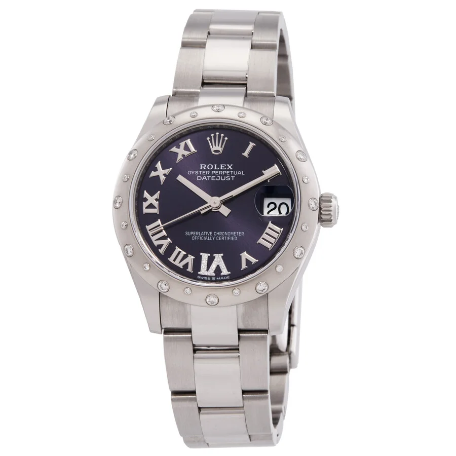 Silver-tone stainless steel/18k white gold case with a silver-tone stainless steel rolex oyster bracelet. Silver-tone diamond set bezel. Aubergine dial with silver-tone hands and Roman-diamond numeral hour markers. Dial Type: Analog. Date display at the 3 o'clock position. Rolex Calibre 2236 Automatic movement, based upon Rolex 2235, containing 31 Jewels, bitting at 28800 vph, and has a power reserve of approximately 55 hours. Screw down crown. Screw-down case back. Round case shape, case size: 31 mm. Folding clasp. Water resistant at 100 meters / 330 feet. Functions: date, hour, minute, second. Datejust 31 Series. Dress watch style. Watch label: Swiss Made. Rolex Datejust 31 Automatic Diamond Ladies Watch 278344OBRDO. GENERAL Box Type: Original Box CASE Case Diameter: 31 mm Case Material: Stainless Steel/18k White Gold Case Shape: Round Case Back: Screw-down BAND Band Material: Stainless Steel Rolex Oyster Band Type: Bracelet Band Color: Silver-tone Clasp: Folding DIAL Dial Color: Aubergine Type: Analog Hands: Silver-tone Dial Markers: Roman-Diamond Numeral Bezel Color: Silver-tone Bezel Material: Diamond Set Crown: Screw Down INFORMATION Brand: Rolex Series: Datejust Collection Name: Datejust Gender: Womens Model: 278344OBRDO Watch Label: Swiss Made Movement: Automatic Engine: Rolex Calibre 2236 Power Reserve: 55 FEATURES Water Resistance: 100 meters / 330 feet Calendar: Date display at the 3 o'clock position Functions: Date, Hour, Minute, Second Watch Features: Analog, Gold, Stainless Steel, Diamond ADDITIONAL INFO Watch Style: Dress Warranty: 2 Year Jomashop Warranty Jomashop Sku: RLX278344OBRDO Department: Watches Category: Watches
