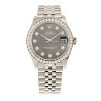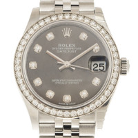 Silver-tone stainless steel/18k white gold case with a silver-tone stainless steel rolex jubilee bracelet. Silver-tone diamond set bezel. Dark grey dial with silver-tone hands and diamond hour markers. Dial Type: Analog. Date display at the 3 o'clock position. Rolex Calibre 2236 Automatic movement, based upon Rolex 2235, containing 31 Jewels, bitting at 28800 vph, and has a power reserve of approximately 55 hours. Scratch resistant sapphire crystal. Screw down crown. Screw-down case back. Round case shape, case size: 31 mm. Folding clasp. Water resistant at 100 meters / 330 feet. Functions: date, hour, minute, second. Datejust 31 Series. Dress watch style. Watch label: Swiss Made. Rolex Datejust 31 Automatic Diamond Ladies Watch 278384GYDJ. GENERAL Box Type: Original Box CASE Case Size: 31 Case Material: Stainless Steel/18k White Gold Case Shape: Round Case Back: Screw-down BAND Band Material: Stainless Steel Rolex Jubilee Band Type: Bracelet Band Color: Silver-tone Clasp: Folding DIAL Dial Color: Dark Grey Type: Analog Crystal: Scratch Resistant Sapphire Hands: Silver-tone Dial Markers: Diamond Bezel Color: Silver-tone Bezel Material: Diamond Set Crown: Screw Down INFORMATION Brand: Rolex Series: Datejust Collection Name: Datejust Gender: Womens Model: 278384GYDJ Watch Label: Swiss Made Movement: Automatic Engine: Rolex Calibre 2236 FEATURES Water Resistance: 100 meters / 330 feet Calendar: Date display at the 3 o'clock position Functions: Date, Hour, Minute, Second Watch Features: Analog, Gold, Stainless Steel, Diamond ADDITIONAL INFO Watch Style: Dress Warranty: 2 Year Jomashop Warranty Jomashop Sku: RLX278384GYDJ Item Variation: M278384RBR-0010 Department: Watches Category: Watches