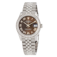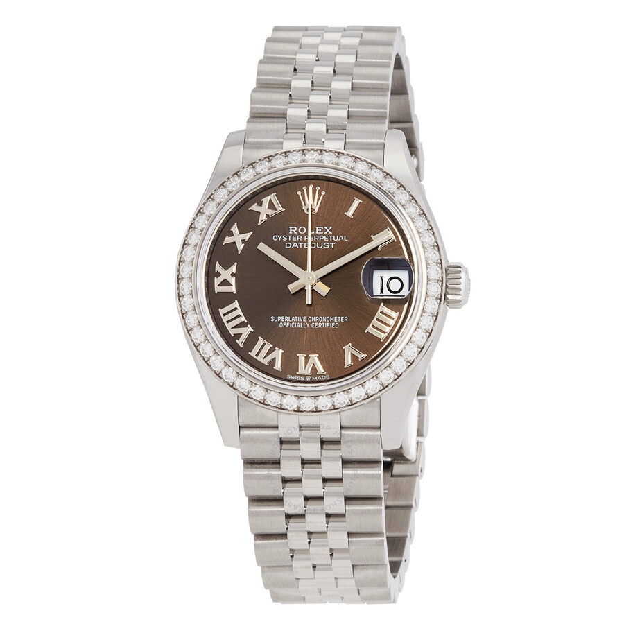 Silver-tone stainless steel/18k white gold case with a silver-tone stainless steel rolex jubilee bracelet. Silver-tone diamond set bezel. Dark grey dial with silver-tone hands and Roman- diamond numeral hour markers. Dial Type: Analog. Date display at the 3 o'clock position. Rolex Calibre 2236 Automatic movement, based upon Rolex 2235, containing 31 Jewels, bitting at 28800 vph, and has a power reserve of approximately 55 hours. Scratch resistant sapphire crystal. Screw down crown. Screw-down case back. Round case shape, case size: 31 mm. Folding clasp. Water resistant at 100 meters / 330 feet. Functions: date, hour, minute, second. Datejust 31 Series. Dress watch style. Watch label: Swiss Made. Rolex Datejust 31 Automatic Diamond Ladies Watch 278384GYRDJ. INFORMATION Brand: Rolex Series: Datejust Collection Name: Datejust Gender: Womens Model: 278384GYRDJ Watch Label: Swiss Made Movement: Automatic Engine: Rolex Calibre 2236 CASE Case Size: 31 mm Case Material: Stainless Steel/18k White Gold Case Shape: Round Case Back: Screw-down BAND Band Material: Stainless Steel Rolex Jubilee Band Type: Bracelet Band Color: Silver-tone Clasp: Folding DIAL Dial Color: Dark Grey Type: Analog Crystal: Scratch Resistant Sapphire Hands: Silver-tone Dial Markers: Roman- Diamond Numeral Bezel Color: Silver-tone Bezel Material: Diamond Set Crown: Screw Down FEATURES Water Resistance: 100 meters / 330 feet Calendar: Date display at the 3 o'clock position Functions: Date, Hour, Minute, Second Watch Features: Diamond, Stainless Steel, Gold, Analog ADDITIONAL INFO Watch Style: Dress Warranty: 2 Year Jomashop Warranty Jomashop Sku: RLX278384GYRDJ Item Variation: M278384RBR-0032 Department: Watches Category: Watches