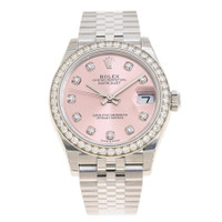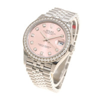Silver-tone stainless steel/ 18k white gold case with a silver-tone stainless steel rolex jubilee bracelet. Silver-tone diamond set bezel. Pink dial with silver-tone hands and diamond hour markers. Dial Type: Analog. Date display at the 3 o'clock position. Rolex Calibre 2236 Automatic movement, based upon Rolex 2235, containing 31 Jewels, bitting at 28800 vph, and has a power reserve of approximately 55 hours. Scratch resistant sapphire crystal. Screw down crown. Screw-down case back. Round case shape, case size: 31 mm. Folding clasp. Water resistant at 100 meters / 330 feet. Functions: date, hour, minute, second. Datejust 31 Series. Dress watch style. Watch label: Swiss Made. Rolex Datejust 31 Automatic Diamond Pink Dial Ladies Watch 278384PDJ. CASE Case Size: 31 Case Material: Stainless Steel/ 18k White Gold Case Shape: Round Case Back: Screw-down BAND Band Material: Stainless Steel Rolex Jubilee Band Type: Bracelet Band Color: Silver-tone Clasp: Folding DIAL Dial Color: Pink Type: Analog Crystal: Scratch Resistant Sapphire Hands: Silver-tone Dial Markers: Diamond Bezel Color: Silver-tone Bezel Material: Diamond Set Crown: Screw Down INFORMATION Brand: Rolex Series: Datejust Collection Name: Datejust Gender: Womens Model: 278384PDJ Watch Label: Swiss Made Movement: Automatic Engine: Rolex Calibre 2236 FEATURES Water Resistance: 100 meters / 330 feet Calendar: Date display at the 3 o'clock position Functions: Date, Hour, Minute, Second Watch Features: Analog, Gold, Stainless Steel, Diamond ADDITIONAL INFO Watch Style: Dress Warranty: 2 Year Jomashop Warranty Jomashop Sku: RLX278384PDJ Department: Watches Category: Watches