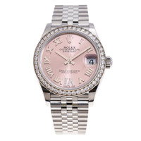 Silver-tone stainless steel/18k white gold case with a silver-tone stainless steel rolex jubilee bracelet. Silver-tone diamond set bezel. Pink dial with silver-tone hands and Roman- diamond numeral hour markers. Dial Type: Analog. Date display at the 3 o'clock position. Rolex Calibre 2236 Automatic movement, based upon Rolex 2235, containing 31 Jewels, bitting at 28800 vph, and has a power reserve of approximately 55 hours. Scratch resistant sapphire crystal. Screw down crown. Screw-down case back. Round case shape, case size: 31 mm. Folding clasp. Water resistant at 100 meters / 330 feet. Functions: date, hour, minute, second. Datejust 31 Series. Dress watch style. Watch label: Swiss Made. Rolex Datejust 31 Automatic Diamond Pink Dial Ladies Watch 278384PRDJ. GENERAL Box Type: Original Box CASE Case Size: 31 Case Material: Stainless Steel/18k White Gold Case Shape: Round Case Back: Screw-down BAND Band Material: Stainless Steel Rolex Jubilee Band Type: Bracelet Band Color: Silver-tone Clasp: Folding DIAL Dial Color: Pink Type: Analog Crystal: Scratch Resistant Sapphire Hands: Silver-tone Dial Markers: Roman- Diamond Numeral Bezel Color: Silver-tone Bezel Material: Diamond Set Crown: Screw Down INFORMATION Brand: Rolex Series: Datejust Collection Name: Datejust Gender: Womens Model: 278384PRDJ Watch Label: Swiss Made Movement: Automatic Engine: Rolex Calibre 2236 FEATURES Water Resistance: 100 meters / 330 feet Calendar: Date display at the 3 o'clock position Functions: Date, Hour, Minute, Second Watch Features: Analog, Gold, Stainless Steel, Diamond ADDITIONAL INFO Watch Style: Dress Warranty: 2 Year Jomashop Warranty Jomashop Sku: RLX278384PRDJ Department: Watches Category: Watches