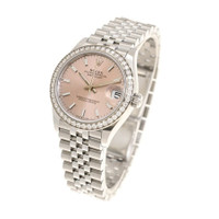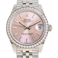 Silver-tone stainless steel/ 18k white gold case with a silver-tone stainless steel rolex jubilee bracelet. Silver-tone diamond set bezel. Pink dial with silver-tone hands and index hour markers. Dial Type: Analog. Luminescent hands and markers. Date display at the 3 o'clock position. Rolex Calibre 2236 Automatic movement, based upon Rolex 2235, containing 31 Jewels, bitting at 28800 vph, and has a power reserve of approximately 55 hours. Scratch resistant sapphire crystal. Screw down crown. Screw-down case back. Round case shape, case size: 31 mm. Folding clasp. Water resistant at 100 meters / 330 feet. Functions: date, hour, minute, second. Datejust 31 Series. Dress watch style. Watch label: Swiss Made. Rolex Datejust 31 Automatic Diamond Pink Dial Ladies Watch 278384PSJ. GENERAL Box Type: Original Box CASE Case Diameter: 31 mm Case Material: Stainless Steel/ 18k White Gold Case Shape: Round Case Back: Screw-down BAND Band Material: Stainless Steel Rolex Jubilee Band Type: Bracelet Band Color: Silver-tone Clasp: Folding DIAL Dial Color: Pink Type: Analog Crystal: Scratch Resistant Sapphire Hands: Silver-tone Dial Markers: Index Luminiscence: Hands and Markers Bezel Color: Silver-tone Bezel Material: Diamond Set Crown: Screw Down INFORMATION Brand: Rolex Series: Datejust Collection Name: Datejust Gender: Womens Model: 278384PSJ Watch Label: Swiss Made Movement: Automatic Engine: Rolex Calibre 2236 FEATURES Water Resistance: 100 meters / 330 feet Calendar: Date display at the 3 o'clock position Functions: Date, Hour, Minute, Second Watch Features: Analog, Gold, Stainless Steel, Diamond ADDITIONAL INFO Watch Style: Dress Warranty: 2 Year Jomashop Warranty Jomashop Sku: RLX278384PSJ Department: Watches Category: Watches