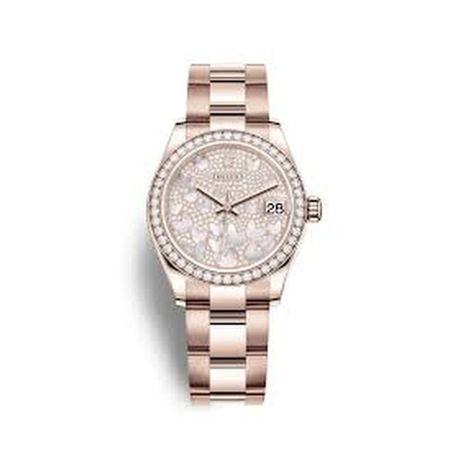 18 ct everose gold case with a 18 ct everose gold rolex oyster bracelet. Mother of pearl butterfly, paved dial with everose gold hands. Dial Type: Analog. Date display at the 3 o'clock position. Rolex Calibre 2236 automatic movement with a 55-hour power reserve. Scratch resistant sapphire crystal. Screw down crown. Solid case back. Round case shape. Case size: 31 mm. Water resistant at 100 meters / 330 feet. Functions: date, hour, minute, second. Luxury watch style. Watch label: Swiss Made. Rolex Datejust 31 Automatic Mother of Pearl Butterfly Diamond Pave Dial Ladies 18 ct Everose Gold Oyster Watch 278285PAVEO. INFORMATION Brand: Rolex Series: Datejust Collection Name: Datejust Gender: Womens Model: 278285PAVEO Watch Label: Swiss Made Movement: Automatic Engine: Rolex Calibre 2236 Power Reserve: 55 hours CASE Case Size: 31 mm Case Material: 18 ct Everose Gold Case Shape: Round Case Back: Solid BAND Band Material: 18 ct Everose Gold Rolex Oyster Band Type: Bracelet DIAL Dial Color: Mother of Pearl Butterfly, Paved Type: Analog Crystal: Scratch Resistant Sapphire Hands: Everose Gold Bezel: Fixed Bezel Color: 18 ct Everose Gold Bezel Material: Diamond Set Crown: Screw Down FEATURES Water Resistance: 100 meters / 330 feet Calendar: Date display at the 3 o'clock position Functions: Date, Hour, Minute, Second Watch Features: Diamond, Gold, Analog ADDITIONAL INFO Watch Style: Luxury Warranty: 2 Year Jomashop Warranty Jomashop Sku: RLX278285PAVEO Department: Watches Category: Watches