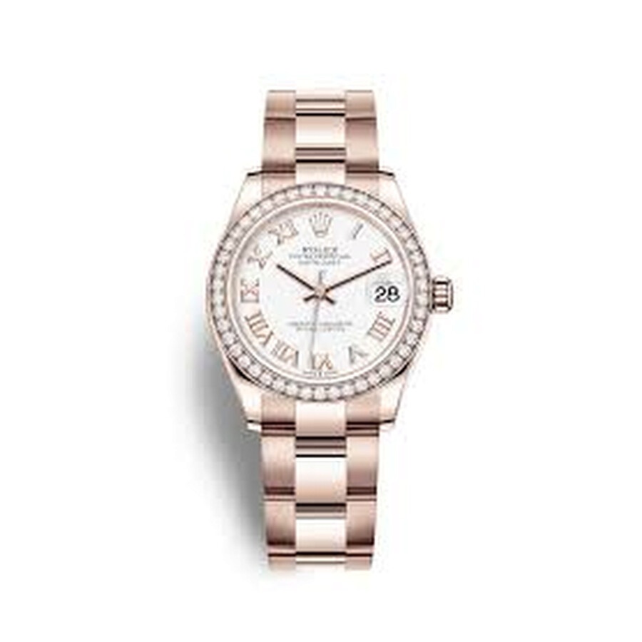 18 ct everose gold case with a 18 ct everose gold rolex oyster bracelet. White dial with everose gold hands and Roman numeral hour markers. Dial Type: Analog. Date display at the 3 o'clock position. Rolex Calibre 2236 automatic movement with a 55-hour power reserve. Scratch resistant sapphire crystal. Screw down crown. Solid case back. Round case shape. Case size: 31 mm. Water resistant at 100 meters / 330 feet. Functions: date, hour, minute, second. Luxury watch style. Watch label: Swiss Made. Rolex Datejust 31 Automatic White Dial Ladies 18 ct Everose Gold Oyster Watch 278285WRO. INFORMATION Brand: Rolex Series: Datejust Collection Name: Datejust Gender: Womens Model: 278285WRO Watch Label: Swiss Made Movement: Automatic Engine: Rolex Calibre 2236 Power Reserve: 55 hours CASE Case Size: 31 mm Case Material: 18 ct Everose Gold Case Shape: Round Case Back: Solid BAND Band Material: 18 ct Everose Gold Rolex Oyster Band Type: Bracelet DIAL Dial Color: White Type: Analog Crystal: Scratch Resistant Sapphire Hands: Everose Gold Dial Markers: Roman Numeral Bezel: Fixed Bezel Color: 18 ct Everose Gold Bezel Material: Diamond Set Crown: Screw Down FEATURES Water Resistance: 100 meters / 330 feet Calendar: Date display at the 3 o'clock position Functions: Date, Hour, Minute, Second Watch Features: Gold, Analog ADDITIONAL INFO Watch Style: Luxury Warranty: 2 Year Jomashop Warranty Jomashop Sku: RLX278285WRO Department: Watches Category: Watches
