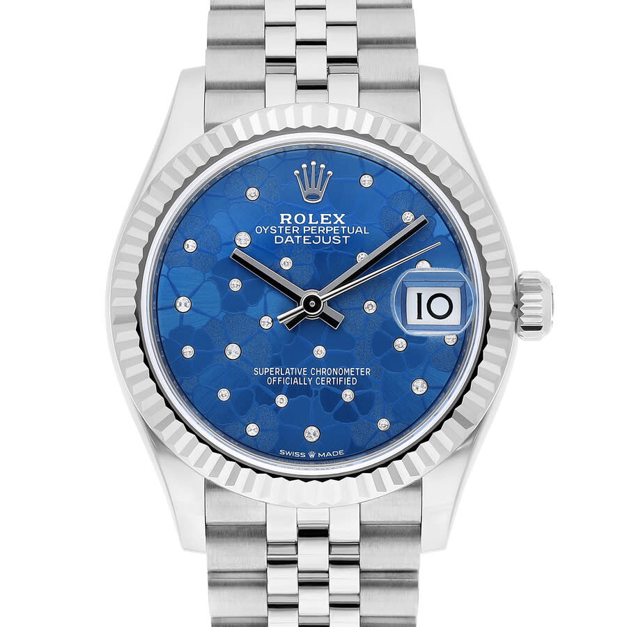 Stainless steel and white gold case with a stainless steel and white gold jubilee bracelet. Fixed, fluted bezel. Azzurro-blue floral motif dial. Dial Type: Analog. Date display at the 3 o'clock position. Rolex Calibre 2236 Automatic movement, based upon Rolex 2235, containing 31 Jewels, bitting at 28800 vph, and has a power reserve of approximately 55 hours. Scratch resistant sapphire crystal. Screw down crown. Solid case back. Round case shape, case size: 31 mm. Concealed folding clasp. Water resistant at 100 meters / 330 feet. Functions: date, hour, minute, second. Additional Info: dial features 24 diamonds. Datejust 31 Series. Luxury watch style. Watch label: Swiss Made. Rolex Datejust 31 Azzurro-Blue Floral Motif Diamond Dial Automatic Ladies Steel and White Gold Jubilee Watch M278274-0036. GENERAL Box Type: Original Box CASE Case Diameter: 31 mm Case Material: Stainless Steel Case Shape: Round Case Back: Solid BAND Band Material: Stainless Steel Jubilee Band Type: Bracelet Band Color: Silver-tone Clasp: Concealed Folding DIAL Dial Color: Azzurro-Blue Floral Motif Type: Analog Crystal: Scratch Resistant Sapphire Hands: Silver-tone Bezel: Fixed, Fluted Bezel Material: 18kt White Gold Crown: Screw Down INFORMATION Brand: Rolex Series: Datejust Collection Name: Datejust Gender: Womens Model: M278274-0036 Watch Label: Swiss Made Movement: Automatic Engine: Rolex Calibre 2236 Power Reserve: 55 hours FEATURES Water Resistance: 100 meters / 330 feet Calendar: Date display at the 3 o'clock position Functions: Date, Hour, Minute, Second Watch Features: Analog, Gold, Stainless Steel, Diamond ADDITIONAL INFO Watch Style: Luxury Warranty: 2 Year Jomashop Warranty Additional Info: dial features 24 diamonds Jomashop Sku: RLX278274-0036 Item Variation: 278274-0036 Department: Watches Category: Watches