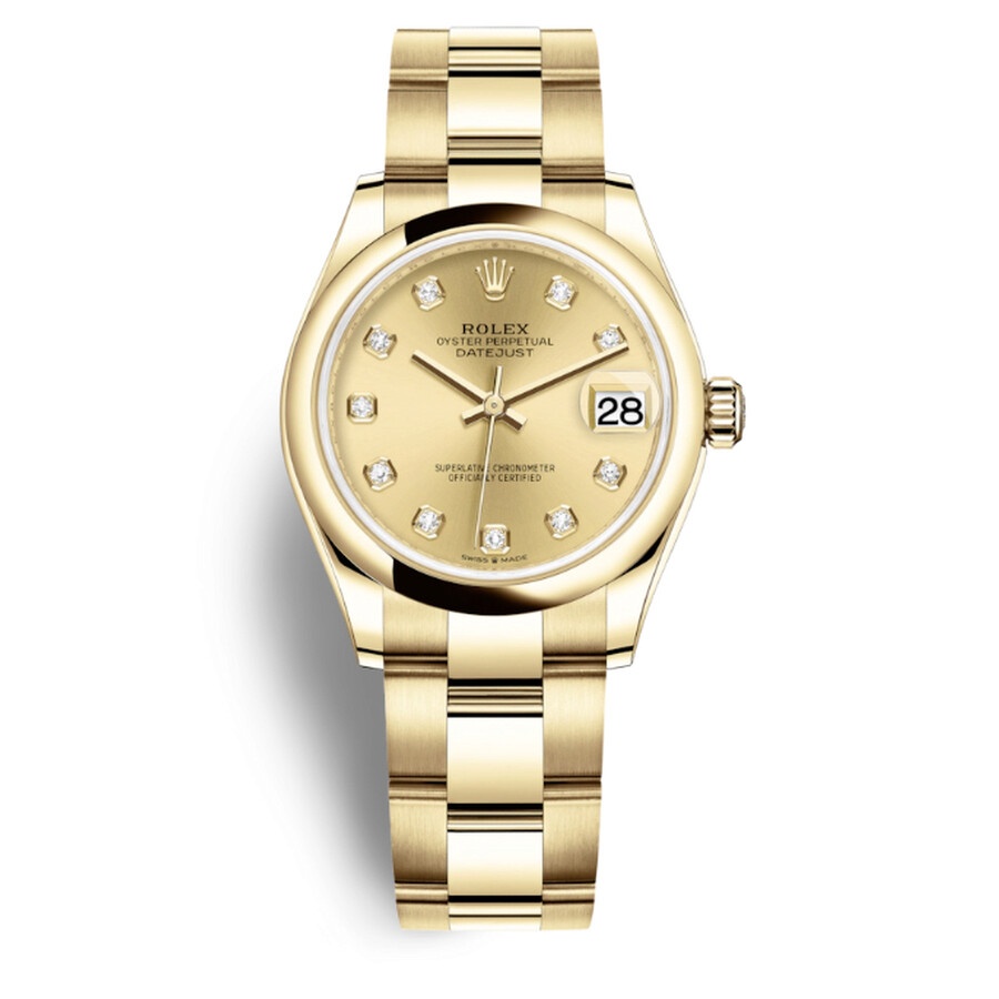18kt yellow gold case with a 18kt yellow gold rolex oyster bracelet. Fixed 18kt yellow gold bezel. Champagne dial with gold-tone hands and diamond hour markers. Dial Type: Analog. Date display at the 3 o'clock position. Rolex Calibre 2236 Automatic movement, based upon Rolex 2235, containing 31 Jewels, bitting at 28800 vph, and has a power reserve of approximately 55 hours. Scratch resistant sapphire crystal. Screw down crown. Solid case back. Round case shape. Case size: 31 mm. Water resistant at 100 meters / 330 feet. Functions: date, hour, minute, second. Luxury watch style. Watch label: Swiss Made. Rolex Datejust 31 Champagne Diamond Dial Automatic Ladies 18kt Yellow Gold Oyster Watch 278248CDO. INFORMATION Brand: Rolex Series: Datejust Collection Name: Datejust Gender: Womens Model: 278248CDO Watch Label: Swiss Made Movement: Automatic Engine: Rolex Calibre 2236 CASE Case Size: 31 mm Case Material: 18kt Yellow Gold Case Shape: Round Case Back: Solid BAND Band Material: 18kt Yellow Gold Rolex Oyster Band Type: Bracelet DIAL Dial Color: Champagne Type: Analog Crystal: Scratch Resistant Sapphire Hands: Gold-tone Dial Markers: Diamond Bezel: Fixed Bezel Material: 18kt Yellow Gold Crown: Screw Down FEATURES Water Resistance: 100 meters / 330 feet Calendar: Date display at the 3 o'clock position Functions: Date, Hour, Minute, Second Watch Features: Diamond, Gold, Analog ADDITIONAL INFO Watch Style: Luxury Warranty: 2 Year Jomashop Warranty Jomashop Sku: RLX278248CDO Department: Watches Category: Watches