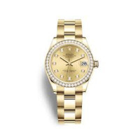 18kt yellow gold case with a 18kt yellow gold rolex oyster bracelet. Fixed bezel. Champagne dial with yellow gold hands and diamonds hour markers. Dial Type: Analog. Date display at the 3 o'clock position. Rolex Calibre 2236 automatic movement. Scratch resistant sapphire crystal. Screw down crown. Solid case back. Round case shape. Case size: 31 mm. Water resistant at 100 meters / 330 feet. Functions: date, hour, minute, second. Luxury watch style. Watch label: Swiss Made. Rolex Datejust 31 Champagne Diamond Dial Automatic Ladies 18kt Yellow Gold Oyster Watch 278288CDO. INFORMATION Brand: Rolex Series: Datejust Collection Name: Datejust Gender: Womens Model: 278288CDO Watch Label: Swiss Made Movement: Automatic Engine: Rolex Calibre 2236 CASE Case Size: 31 mm Case Material: 18kt Yellow Gold Case Shape: Round Case Back: Solid BAND Band Material: 18kt Yellow Gold Rolex Oyster Band Type: Bracelet DIAL Dial Color: Champagne Type: Analog Crystal: Scratch Resistant Sapphire Hands: Yellow Gold Dial Markers: Diamonds Bezel: Fixed Bezel Color: 18kt Yellow Gold Bezel Material: Diamond Set Crown: Screw Down FEATURES Water Resistance: 100 meters / 330 feet Calendar: Date display at the 3 o'clock position Functions: Date, Hour, Minute, Second Watch Features: Diamond, Gold, Analog ADDITIONAL INFO Watch Style: Luxury Warranty: 2 Year Jomashop Warranty Jomashop Sku: RLX278288CDO Department: Watches Category: Watches