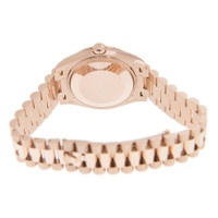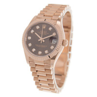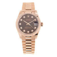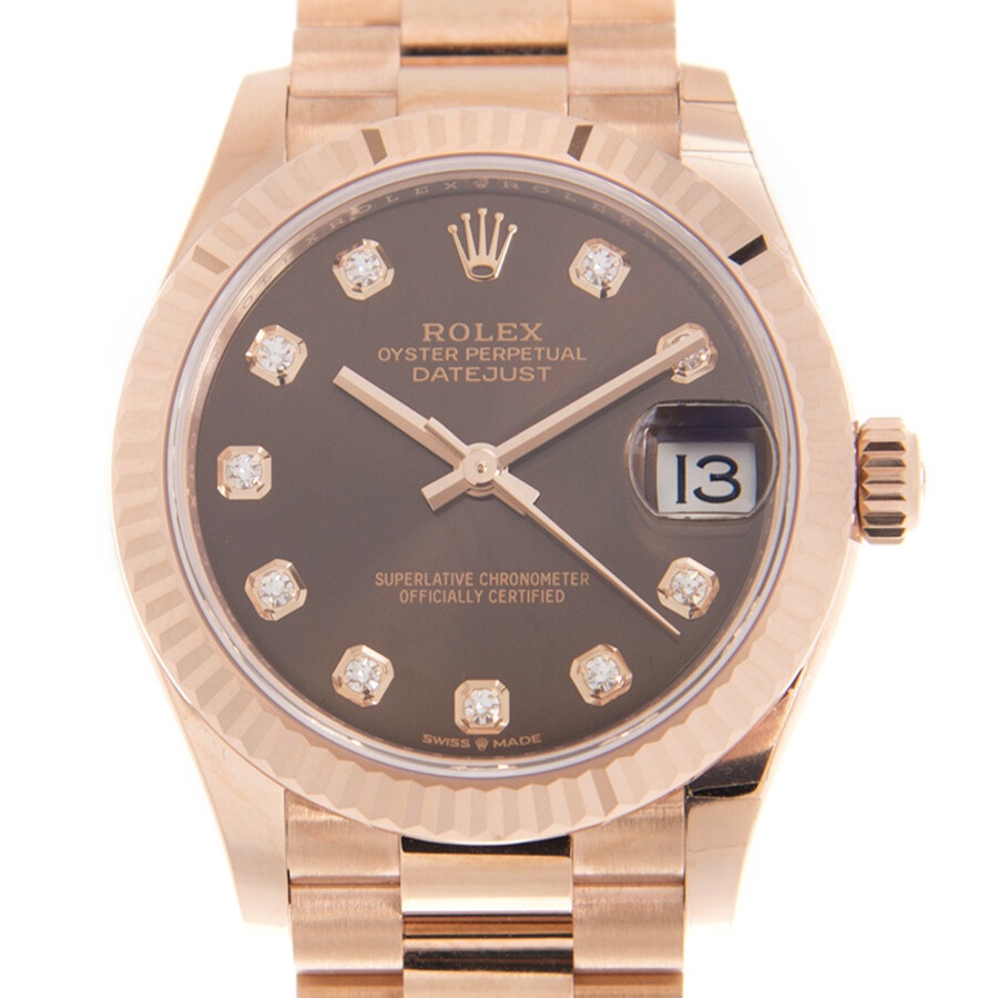 18kt everose gold case with a 18kt everose gold rolex president bracelet. Fixed-fluted 18kt everose gold bezel. Chocolate dial with everose gold hands and diamonds hour markers. Dial Type: Analog. Date display at the 3 o'clock position. Rolex Calibre 2236 automatic movement with a 55-hour power reserve. Scratch resistant sapphire crystal. Screw down crown. Solid case back. Round case shape. Case size: 31 mm. Water resistant at 100 meters / 330 feet. Functions: date, hour, minute, second. Luxury watch style. Watch label: Swiss Made. Rolex Datejust 31 Chocolate Diamond Dial Ladies 18kt Everose Gold President Watch 278275CHDP. CASE Case Size: 31 Case Material: 18kt Everose Gold Case Shape: Round Case Back: Solid BAND Band Material: 18kt Everose Gold Rolex President Band Type: Bracelet DIAL Dial Color: Chocolate Type: Analog Crystal: Scratch Resistant Sapphire Hands: Everose Gold Dial Markers: Diamonds Bezel: Fixed Fluted Bezel Material: 18kt Everose Gold Crown: Screw Down INFORMATION Brand: Rolex Series: Datejust Collection Name: Datejust Gender: Womens Model: M278275-0010 Watch Label: Swiss Made Movement: Automatic Engine: Rolex Calibre 2236 Power Reserve: 55 hours FEATURES Water Resistance: 100 meters / 330 feet Calendar: Date display at the 3 o'clock position Functions: Date, Hour, Minute, Second Watch Features: Diamond, Gold, Analog ADDITIONAL INFO Watch Style: Luxury Warranty: 2 Year Jomashop Warranty Jomashop Sku: RLX278275CHDP Item Variation: 278275-0010, 278275CHDP Department: Watches Category: Watches