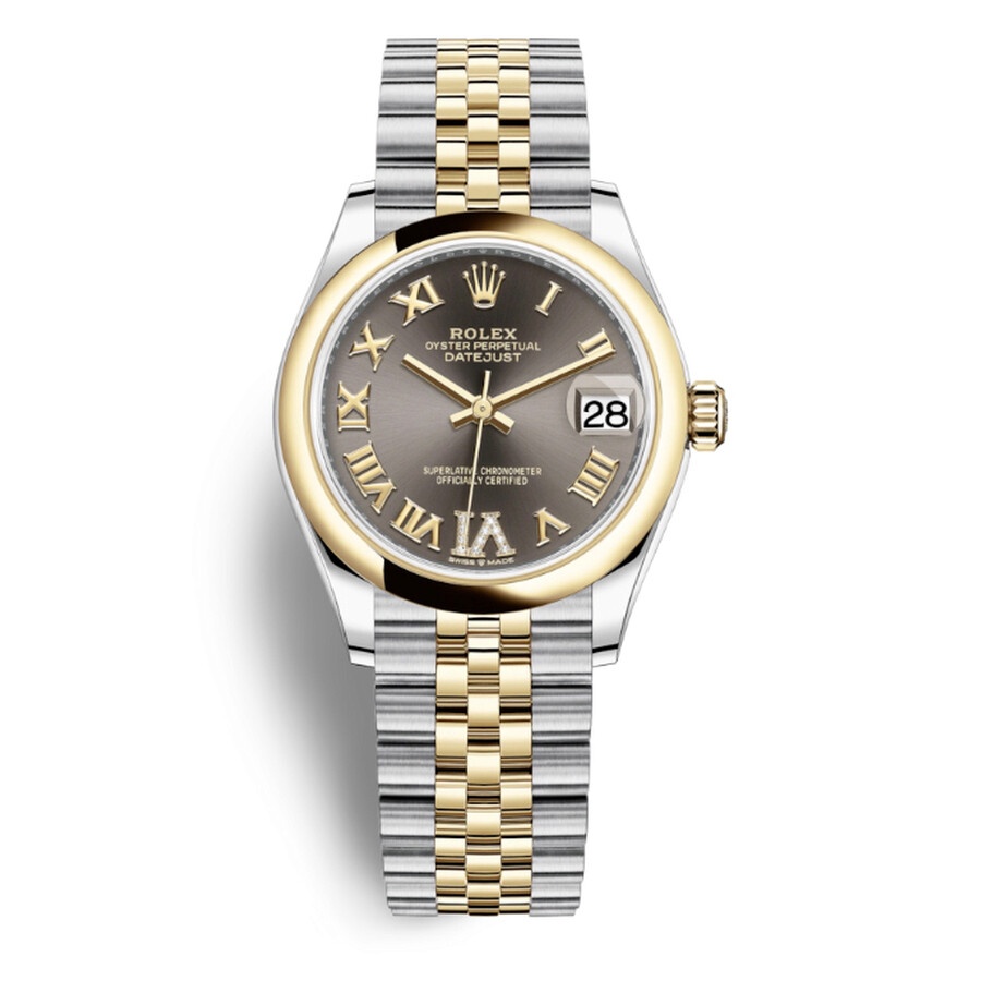 Stainless steel and 18kt yellow gold case with a steel and 18kt yellow gold jubilee bracelet. Fixed 18kt yellow gold bezel. Dark grey dial with gold-tone hands and Roman- diamond numerals hour markers. Dial Type: Analog. Date display at the 3 o'clock position. Rolex Calibre 2236 Automatic movement, based upon Rolex 2235, containing 31 Jewels, bitting at 28800 vph, and has a power reserve of approximately 55 hours. Scratch resistant sapphire crystal. Screw down crown. Solid case back. Round case shape. Case size: 31 mm. Folding clasp. Water resistant at 100 meters / 330 feet. Functions: date, hour, minute, second. Luxury watch style. Watch label: Swiss Made. Rolex Datejust 31 Dark Grey Dial Steel and 18kt Yellow Gold Jubilee Watch 278243GYRDJ. INFORMATION Brand: Rolex Series: Datejust Collection Name: Datejust Gender: Womens Model: 278243GYRDJ Watch Label: Swiss Made Movement: Automatic Engine: Rolex Calibre 2236 Power Reserve: 55 hours CASE Case Size: 31 mm Case Material: Stainless Steel and 18kt Yellow Gold Case Shape: Round Case Back: Solid BAND Band Material: Steel and 18kt Yellow Gold Jubilee Band Type: Bracelet Clasp: Folding DIAL Dial Color: Dark Grey Type: Analog Crystal: Scratch Resistant Sapphire Hands: Gold-tone Dial Markers: Roman- Diamond Numerals Bezel: Fixed Bezel Material: 18kt Yellow Gold Crown: Screw Down FEATURES Water Resistance: 100 meters / 330 feet Calendar: Date display at the 3 o'clock position Functions: Date, Hour, Minute, Second Watch Features: Diamond, Stainless Steel, Gold, Analog ADDITIONAL INFO Watch Style: Luxury Warranty: 2 Year Jomashop Warranty Jomashop Sku: RLX278243GYRDJ Department: Watches Category: Watches