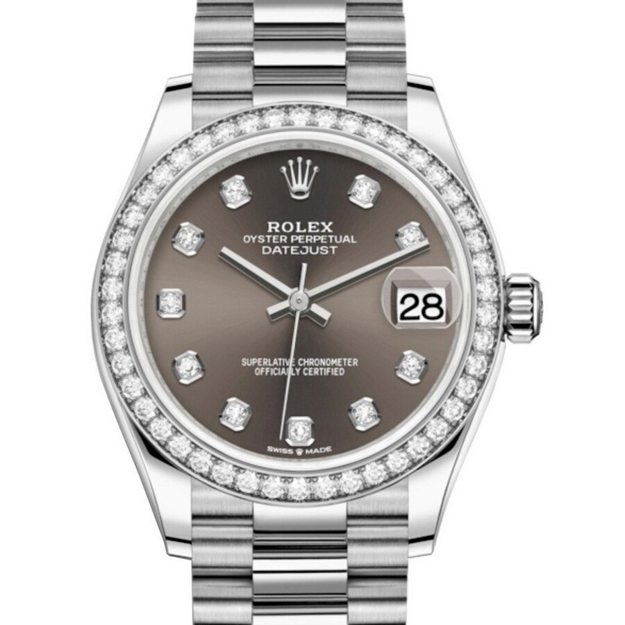18kt white gold case with a 18kt white gold rolex preident bracelet. Fixed white diamond set bezel. Dark grey dial with silver-tone hands and diamonds hour markers. Dial Type: Analog. Date display at the 3 o'clock position. Rolex Calibre 2236 automatic movement with a 55-hour power reserve. Scratch resistant sapphire crystal. Screw down crown. Solid case back. Round case shape. Case size: 31 mm. Water resistant at 100 meters / 330 feet. Functions: date, hour, minute, second. Luxury watch style. Watch label: Swiss Made. Rolex Datejust 31 Dark Grey Diamond Dial Ladies 18kt White Gold President Watch 278289GYDP. INFORMATION Brand: Rolex Series: Datejust Collection Name: Datejust Gender: Womens Model: 278289GYDP Watch Label: Swiss Made Movement: Automatic Engine: Rolex Calibre 2236 Power Reserve: 55 hours CASE Case Size: 31 mm Case Material: 18kt White Gold Case Shape: Round Case Back: Solid BAND Band Material: 18kt White Gold Rolex Preident Band Type: Bracelet Clasp: Crownclasp DIAL Dial Color: Dark Grey Type: Analog Crystal: Scratch Resistant Sapphire Hands: Silver-tone Dial Markers: Diamonds Bezel: Fixed Bezel Color: White Bezel Material: Diamond Set Crown: Screw Down FEATURES Water Resistance: 100 meters / 330 feet Calendar: Date display at the 3 o'clock position Functions: Date, Hour, Minute, Second Watch Features: Diamond, Gold, Analog ADDITIONAL INFO Watch Style: Luxury Warranty: 2 Year Jomashop Warranty Jomashop Sku: RLX278289GYDP Department: Watches Category: Watches