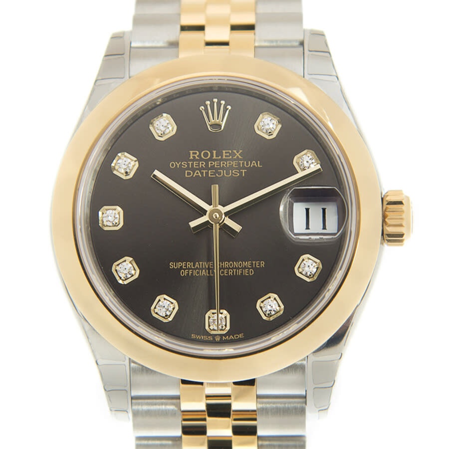 Stainless steel and 18kt yellow gold case with a steel and 18kt yellow gold jubilee bracelet. Fixed 18kt yellow gold bezel. Dark grey dial with gold-tone hands and diamond hour markers. Dial Type: Analog. Date display at the 3 o'clock position. Rolex Calibre 2236 Automatic movement, based upon Rolex 2235, containing 31 Jewels, bitting at 28800 vph, and has a power reserve of approximately 55 hours. Scratch resistant sapphire crystal. Screw down crown. Solid case back. Round case shape. Case size: 31 mm. Folding clasp. Water resistant at 100 meters / 330 feet. Functions: date, hour, minute, second. Luxury watch style. Watch label: Swiss Made. Rolex Datejust 31 Dark Grey Diamond Dial Ladies Steel and 18kt Yellow Gold Jubilee Watch 278243GYDJ. INFORMATION Brand: Rolex Series: Datejust Collection Name: Datejust Gender: Womens Model: 278243GYDJ Watch Label: Swiss Made Movement: Automatic Engine: Rolex Calibre 2236 Power Reserve: 55 hours CASE Case Size: 31 mm Case Material: Stainless Steel and 18kt Yellow Gold Case Shape: Round Case Back: Solid BAND Band Material: Steel and 18kt Yellow Gold Jubilee Band Type: Bracelet Clasp: Folding DIAL Dial Color: Dark Grey Type: Analog Crystal: Scratch Resistant Sapphire Hands: Gold-tone Dial Markers: Diamond Bezel: Fixed Bezel Material: 18kt Yellow Gold Crown: Screw Down FEATURES Water Resistance: 100 meters / 330 feet Calendar: Date display at the 3 o'clock position Functions: Date, Hour, Minute, Second Watch Features: Diamond, Stainless Steel, Gold, Analog ADDITIONAL INFO Watch Style: Luxury Warranty: 2 Year Jomashop Warranty Jomashop Sku: RLX278243GYDJ Department: Watches Category: Watches