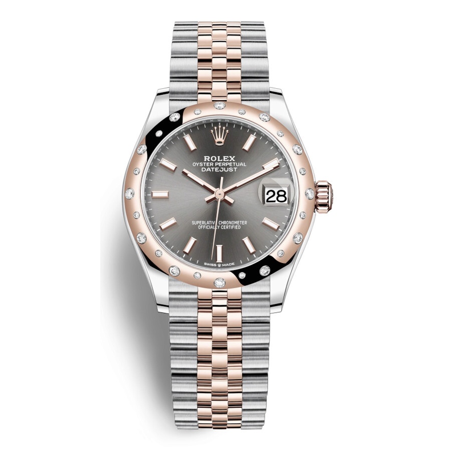 Stainless steel and 18kt everose gold case with a two-tone (silver-tone and rose gold-tone) stainless steel and 18kt everose gold jubilee bracelet. Fixed- domed 18kt everose gold diamond set bezel. Dark rhodium dial with everose gold hands and index hour markers. Dial Type: Analog. Date display at the 3 o'clock position. Rolex Calibre 2236 Automatic movement, based upon Rolex 2235, containing 31 Jewels, bitting at 28800 vph, and has a power reserve of approximately 55 hours. Scratch resistant sapphire crystal. Screw down crown. Solid case back. Round case shape, case size: 31 mm. Water resistant at 100 meters / 330 feet. Functions: date, hour, minute, second. Datejust 31 Series. Luxury watch style. Watch label: Swiss Made. Rolex Datejust 31 Dark Rhodium Automatic Diamond Ladies Watch 278341DRSJ. INFORMATION Brand: Rolex Series: Datejust Collection Name: Datejust Gender: Womens Model: 278341DRSJ Watch Label: Swiss Made Movement: Automatic Engine: Rolex Calibre 2236 Power Reserve: 55 hours CASE Case Size: 31 mm Case Material: Stainless Steel and 18kt Everose Gold Case Shape: Round Case Back: Solid BAND Band Material: Stainless Steel and 18kt Everose Gold Jubilee Band Type: Bracelet Band Color: Two-tone (Silver-tone and Rose Gold-tone) DIAL Dial Color: Dark Rhodium Type: Analog Crystal: Scratch Resistant Sapphire Hands: Everose Gold Dial Markers: Index Bezel: Fixed- Domed Bezel Color: 18kt Everose Gold Bezel Material: Diamond Set Crown: Screw Down FEATURES Water Resistance: 100 meters / 330 feet Calendar: Date display at the 3 o'clock position Functions: Date, Hour, Minute, Second Watch Features: Diamond, Stainless Steel, Gold, Analog ADDITIONAL INFO Watch Style: Luxury Warranty: 2 Year Jomashop Warranty Jomashop Sku: RLX278341DRSJ Department: Watches Category: Watches