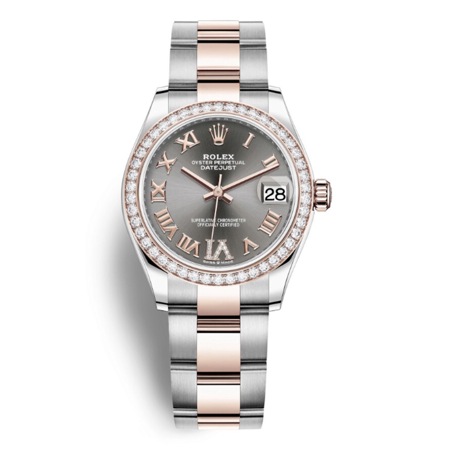 Stainless steel and everose gold case with a stainless steel and everose gold oyster bracelet. Fixed- diamond set everose gold bezel. Dark rhodium dial with everose gold hands and Roman- diamond numerals hour markers. Dial Type: Analog. Date display at the 3 o'clock position. Rolex Calibre 2236 Automatic movement, based upon Rolex 2235, containing 31 Jewels, bitting at 28800 vph, and has a power reserve of approximately 55 hours. Scratch resistant sapphire crystal. Screw down crown. Solid case back. Round case shape. Case size: 31 mm. Folding oyster clasp. Water resistant at 100 meters / 330 feet. Functions: date, hour, minute, second. Luxury watch style. Watch label: Swiss Made. Rolex Datejust 31 Dark Rhodium Automatic Ladies Steel and Everose Gold Oyster Watch 278381DRRDO. INFORMATION Brand: Rolex Series: Datejust Collection Name: Datejust Gender: Womens Model: 278381DRRDO Watch Label: Swiss Made Movement: Automatic Engine: Rolex Calibre 2236 Power Reserve: 55 hours CASE Case Size: 31 mm Case Material: Stainless Steel and Everose Gold Case Shape: Round Case Back: Solid BAND Band Material: Stainless Steel and Everose Gold Oyster Band Type: Bracelet Clasp: Folding Oysterclasp DIAL Dial Color: Dark Rhodium Type: Analog Crystal: Scratch Resistant Sapphire Hands: Everose Gold Dial Markers: Roman- Diamond Numerals Bezel: Fixed- Diamond Set Bezel Material: Everose Gold Crown: Screw Down FEATURES Water Resistance: 100 meters / 330 feet Calendar: Date display at the 3 o'clock position Functions: Date, Hour, Minute, Second Watch Features: Diamond, Stainless Steel, Gold, Analog ADDITIONAL INFO Watch Style: Luxury Warranty: 2 Year Jomashop Warranty Jomashop Sku: RLX278381DRRDO Department: Watches Category: Watches