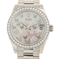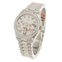 18kt white gold case with a 18kt white gold rolex president bracelet. Fixed-diamond set bezel. Diamond pave dial with silver-tone hands and index hour markers. Dial Type: Analog. Date display at the 3 o'clock position. Rolex Calibre 2236 automatic movement with a 55-hour power reserve. Scratch resistant sapphire crystal. Screw down crown. Solid case back. Round case shape. Case size: 31 mm. Water resistant at 100 meters / 330 feet. Functions: date, hour, minute, second. Luxury watch style. Watch label: Swiss Made. Rolex Datejust 31 Diamond Pave Dial Ladies 18kt White Gold President Watch 278289PAVE. INFORMATION Brand: Rolex Series: Datejust Collection Name: Datejust Gender: Womens Model: 278289PAVE Watch Label: Swiss Made Movement: Automatic Engine: Rolex Calibre 2236 Power Reserve: 55 hours CASE Case Size: 31 mm Case Material: 18kt White Gold Case Shape: Round Case Back: Solid BAND Band Material: 18kt White Gold Rolex President Band Type: Bracelet DIAL Dial Color: Diamond Pave Type: Analog Crystal: Scratch Resistant Sapphire Hands: Silver-tone Dial Markers: Index Bezel: Fixed Bezel Color: 18kt White Gold Bezel Material: Diamond Set Crown: Screw Down FEATURES Water Resistance: 100 meters / 330 feet Calendar: Date display at the 3 o'clock position Functions: Date, Hour, Minute, Second Watch Features: Diamond, Gold, Analog ADDITIONAL INFO Watch Style: Luxury Warranty: 2 Year Jomashop Warranty Jomashop Sku: RLX278289PAVE Department: Watches Category: Watches