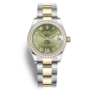 Stainless steel and 18kt yellow gold case with a stainless steel and 18kt yellow gold oyster bracelet. Fixed- diamond set bezel. Olive green dial with yellow gold hands and Roman- diamond hour markers. Dial Type: Analog. Date display at the 3 o'clock position. Rolex Calibre 2236 Automatic movement, based upon Rolex 2235, containing 31 Jewels, bitting at 28800 vph, and has a power reserve of approximately 55 hours. Scratch resistant sapphire crystal. Screw down crown. Solid case back. Round case shape. Case size: 31 mm. Water resistant at 100 meters / 330 feet. Functions: date, hour, minute, second. Luxury watch style. Watch label: Swiss Made. Rolex Datejust 31 Green Diamond Dial Ladies Steel and 18kt Yellow Gold Oyster Watch 278383GNRDO. INFORMATION Brand: Rolex Series: Datejust Collection Name: Datejust Gender: Womens Model: 278383GNRDO Watch Label: Swiss Made Movement: Automatic Engine: Rolex Calibre 2236 Power Reserve: 55 hours CASE Case Size: 31 mm Case Material: Stainless Steel and 18kt Yellow Gold Case Shape: Round Case Back: Solid BAND Band Material: Stainless Steel and 18kt Yellow Gold Oyster Band Type: Bracelet DIAL Dial Color: Green Type: Analog Crystal: Scratch Resistant Sapphire Hands: Yellow Gold Dial Markers: Roman- Diamond Bezel: Fixed- Diamond Set Crown: Screw Down FEATURES Water Resistance: 100 meters / 330 feet Calendar: Date display at the 3 o'clock position Functions: Date, Hour, Minute, Second Watch Features: Diamond, Stainless Steel, Gold, Analog ADDITIONAL INFO Watch Style: Luxury Warranty: 2 Year Jomashop Warranty Jomashop Sku: RLX278383GNRDO Department: Watches Category: Watches
