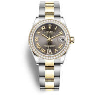 Stainless steel and 18kt yellow gold case with a stainless steel and 18kt yellow gold oyster bracelet. Fixed- diamond set bezel. Grey dial with yellow gold hands and Roman- diamond numerals hour markers. Dial Type: Analog. Date display at the 3 o'clock position. Rolex Calibre 2236 Automatic movement, based upon Rolex 2235, containing 31 Jewels, bitting at 28800 vph, and has a power reserve of approximately 55 hours. Scratch resistant sapphire crystal. Screw down crown. Solid case back. Round case shape. Case size: 31 mm. Water resistant at 100 meters / 330 feet. Functions: date, hour, minute, second. Luxury watch style. Watch label: Swiss Made. Rolex Datejust 31 Grey Dial Ladies Steel and 18kt Yellow Gold Oyster Watch 278383GYRDO. INFORMATION Brand: Rolex Series: Datejust Collection Name: Datejust Gender: Womens Model: 278383GYRDO Watch Label: Swiss Made Movement: Automatic Engine: Rolex Calibre 2236 Power Reserve: 55 hours CASE Case Size: 31 mm Case Material: Stainless Steel and 18kt Yellow Gold Case Shape: Round Case Back: Solid BAND Band Material: Stainless Steel and 18kt Yellow Gold Oyster Band Type: Bracelet DIAL Dial Color: Grey Type: Analog Crystal: Scratch Resistant Sapphire Hands: Yellow Gold Dial Markers: Roman- Diamond Numerals Bezel: Fixed- Diamond Set Crown: Screw Down FEATURES Water Resistance: 100 meters / 330 feet Calendar: Date display at the 3 o'clock position Functions: Date, Hour, Minute, Second Watch Features: Diamond, Stainless Steel, Gold, Analog ADDITIONAL INFO Watch Style: Luxury Warranty: 2 Year Jomashop Warranty Jomashop Sku: RLX278383GYRDO Department: Watches Category: Watches