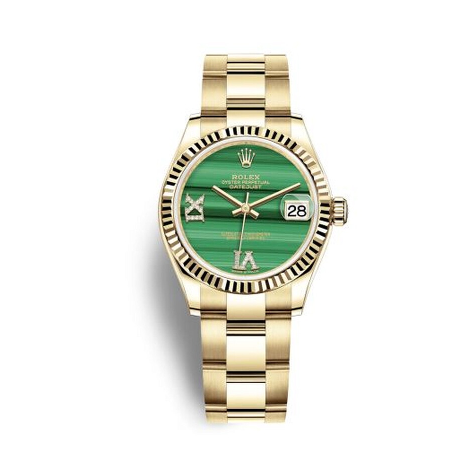 18kt yellow gold case with a 18kt yellow gold rolex oyster bracelet. Fixed-fluted bezel. Malachite dial with yellow gold hands and Roman numeral at the 6 and 9 o' clock hour markers. Dial Type: Analog. Date display at the 3 o'clock position. Rolex Calibre 2236 automatic movement with a 55-hour power reserve. Scratch resistant sapphire crystal. Screw down crown. Solid case back. Round case shape. Case size: 31 mm. Water resistant at 100 meters / 330 feet. Functions: date, hour, minute, second. Luxury watch style. Watch label: Swiss Made. Rolex Datejust 31 Malachite Diamond Dial Ladies 18kt Yellow Gold Oyster Watch 278278MLRDO. INFORMATION Brand: Rolex Series: Datejust Collection Name: Datejust Gender: Womens Model: 278278MLRDO Watch Label: Swiss Made Movement: Automatic Engine: Rolex Calibre 2236 Power Reserve: 55 hours CASE Case Size: 31 mm Case Material: 18kt Yellow Gold Case Shape: Round Case Back: Solid BAND Band Material: 18kt Yellow Gold Rolex Oyster Band Type: Bracelet DIAL Dial Color: Malachite Type: Analog Crystal: Scratch Resistant Sapphire Hands: Yellow Gold Dial Markers: Roman Numeral at the 6 and 9 o' clock Bezel: Fixed Fluted Bezel Material: 18kt Yellow Gold Crown: Screw Down FEATURES Water Resistance: 100 meters / 330 feet Calendar: Date display at the 3 o'clock position Functions: Date, Hour, Minute, Second Watch Features: Diamond, Gold, Analog ADDITIONAL INFO Watch Style: Luxury Warranty: 2 Year Jomashop Warranty Jomashop Sku: RLX278278MLRDO Department: Watches Category: Watches