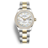 Stainless steel and 18kt yellow gold case with a stainless steel and 18kt yellow gold oyster bracelet. Fixed- diamond set bezel. Mother of pearl dial with diamond hour markers. Dial Type: Analog. Date display at the 3 o'clock position. Rolex Calibre 2236 Automatic movement, based upon Rolex 2235, containing 31 Jewels, bitting at 28800 vph, and has a power reserve of approximately 55 hours. Scratch resistant sapphire crystal. Screw down crown. Solid case back. Round case shape. Case size: 31 mm. Water resistant at 100 meters / 330 feet. Functions: date, hour, minute, second. Luxury watch style. Watch label: Swiss Made. Rolex Datejust 31 Mother of Pearl Diamond Dial Automatic Ladies Steel and 18kt Yellow Gold Oyster Watch 278383MDO. INFORMATION Brand: Rolex Series: Datejust Collection Name: Datejust Gender: Womens Model: 278383MDO Watch Label: Swiss Made Movement: Automatic Engine: Rolex Calibre 2236 Power Reserve: 55 hours CASE Case Size: 31 mm Case Material: Stainless Steel and 18kt Yellow Gold Case Shape: Round Case Back: Solid BAND Band Material: Stainless Steel and 18kt Yellow Gold Oyster Band Type: Bracelet DIAL Dial Color: Mother of Pearl Type: Analog Crystal: Scratch Resistant Sapphire Dial Markers: Diamond Bezel: Fixed- Diamond Set Crown: Screw Down FEATURES Water Resistance: 100 meters / 330 feet Calendar: Date display at the 3 o'clock position Functions: Date, Hour, Minute, Second Watch Features: Diamond, Stainless Steel, Gold, Analog ADDITIONAL INFO Watch Style: Luxury Warranty: 2 Year Jomashop Warranty Jomashop Sku: RLX278383MDO Department: Watches Category: Watches