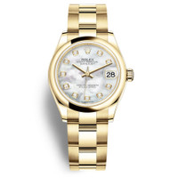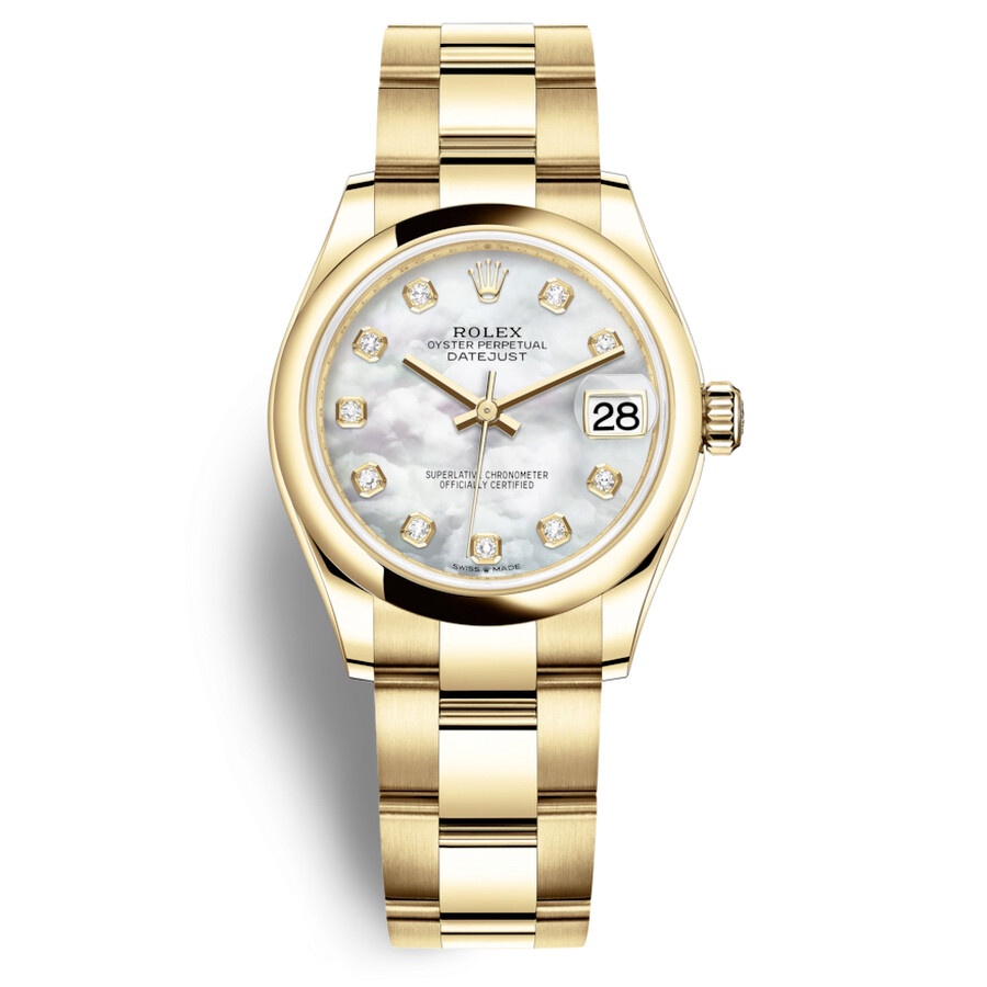 18kt yellow gold case with a 18kt yellow gold rolex oyster bracelet. Fixed 18kt yellow gold bezel. Mother of pearl dial with gold-tone hands and diamond hour markers. Dial Type: Analog. Date display at the 3 o'clock position. Rolex Calibre 2236 Automatic movement, based upon Rolex 2235, containing 31 Jewels, bitting at 28800 vph, and has a power reserve of approximately 55 hours. Scratch resistant sapphire crystal. Screw down crown. Solid case back. Round case shape. Case size: 31 mm. Water resistant at 100 meters / 330 feet. Functions: date, hour, minute, second. Luxury watch style. Watch label: Swiss Made. Rolex Datejust 31 Mother of Pearl Diamond Ladies 18kt Yellow Gold Oyster Watch 278248MDO. INFORMATION Brand: Rolex Series: Datejust Collection Name: Datejust Gender: Womens Model: 278248MDO Watch Label: Swiss Made Movement: Automatic Engine: Rolex Calibre 2236 CASE Case Size: 31 mm Case Material: 18kt Yellow Gold Case Shape: Round Case Back: Solid BAND Band Material: 18kt Yellow Gold Rolex Oyster Band Type: Bracelet DIAL Dial Color: Mother of Pearl Type: Analog Crystal: Scratch Resistant Sapphire Hands: Gold-tone Dial Markers: Diamond Bezel: Fixed Bezel Material: 18kt Yellow Gold Crown: Screw Down FEATURES Water Resistance: 100 meters / 330 feet Calendar: Date display at the 3 o'clock position Functions: Date, Hour, Minute, Second Watch Features: Diamond, Gold, Analog ADDITIONAL INFO Watch Style: Luxury Warranty: 2 Year Jomashop Warranty Jomashop Sku: RLX278248MDO Department: Watches Category: Watches