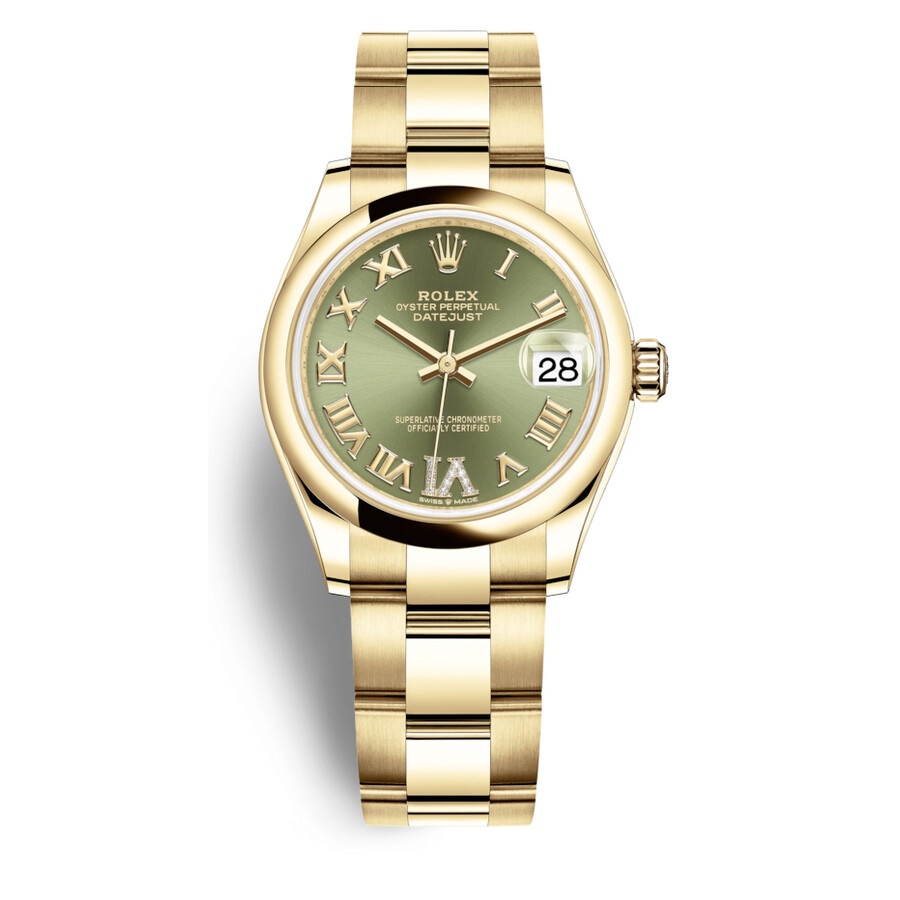 18kt yellow gold case with a 18kt yellow gold rolex oyster bracelet. Fixed 18kt yellow gold bezel. Olive green dial with gold-tone hands and Roman- diamond numerals hour markers. Dial Type: Analog. Date display at the 3 o'clock position. Rolex Calibre 2236 Automatic movement, based upon Rolex 2235, containing 31 Jewels, bitting at 28800 vph, and has a power reserve of approximately 55 hours. Scratch resistant sapphire crystal. Screw down crown. Solid case back. Round case shape. Case size: 31 mm. Water resistant at 100 meters / 330 feet. Functions: date, hour, minute, second. Luxury watch style. Watch label: Swiss Made. Rolex Datejust 31 Olive Green Dial Automatic Ladies 18kt Yellow Gold Oyster Watch 278248GNRDO. INFORMATION Brand: Rolex Series: Datejust Collection Name: Datejust Gender: Womens Model: 278248GNRDO Watch Label: Swiss Made Movement: Automatic Engine: Rolex Calibre 2236 CASE Case Size: 31 mm Case Material: 18kt Yellow Gold Case Shape: Round Case Back: Solid BAND Band Material: 18kt Yellow Gold Rolex Oyster Band Type: Bracelet DIAL Dial Color: Olive Green Type: Analog Crystal: Scratch Resistant Sapphire Hands: Gold-tone Dial Markers: Roman- Diamond Numerals Bezel: Fixed Bezel Material: 18kt Yellow Gold Crown: Screw Down FEATURES Water Resistance: 100 meters / 330 feet Calendar: Date display at the 3 o'clock position Functions: Date, Hour, Minute, Second Watch Features: Diamond, Gold, Analog ADDITIONAL INFO Watch Style: Luxury Warranty: 2 Year Jomashop Warranty Jomashop Sku: RLX278248GNRDO Department: Watches Category: Watches