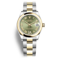Stainless steel and 18kt yellow gold case with a steel and 18kt yellow gold oyster bracelet. Fixed 18kt yellow gold bezel. Olive green dial with gold-tone hands and Roman- diamond numeals hour markers. Dial Type: Analog. Date display at the 3 o'clock position. Rolex Calibre 2236 Automatic movement, based upon Rolex 2235, containing 31 Jewels, bitting at 28800 vph, and has a power reserve of approximately 55 hours. Scratch resistant sapphire crystal. Screw down crown. Solid case back. Round case shape. Case size: 31 mm. Folding clasp. Water resistant at 100 meters / 330 feet. Functions: date, hour, minute, second. Luxury watch style. Watch label: Swiss Made. Rolex Datejust 31 Olive Green Dial Ladies Oyster Watch 278243GNRDO. INFORMATION Brand: Rolex Series: Datejust Collection Name: Datejust Gender: Womens Model: 278243GNRDO Watch Label: Swiss Made Movement: Automatic Engine: Rolex Calibre 2236 Power Reserve: 55 hours CASE Case Size: 31 mm Case Material: Stainless Steel and 18kt Yellow Gold Case Shape: Round Case Back: Solid BAND Band Material: Steel and 18kt Yellow Gold Oyster Band Type: Bracelet Clasp: Folding DIAL Dial Color: Olive Green Type: Analog Crystal: Scratch Resistant Sapphire Hands: Gold-tone Dial Markers: Roman- Diamond Numeals Bezel: Fixed Bezel Material: 18kt Yellow Gold Crown: Screw Down FEATURES Water Resistance: 100 meters / 330 feet Calendar: Date display at the 3 o'clock position Functions: Date, Hour, Minute, Second Watch Features: Diamond, Stainless Steel, Gold, Analog ADDITIONAL INFO Watch Style: Luxury Warranty: 2 Year Jomashop Warranty Jomashop Sku: RLX278243GNRDO Department: Watches Category: Watches
