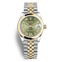 Stainless steel and 18kt yellow gold case with a steel and 18kt yellow gold jubilee bracelet. Fixed 18kt yellow gold bezel. Olive green dial with gold-tone hands and Roman numeral hour markers. Dial Type: Analog. Date display at the 3 o'clock position. Rolex Calibre 2236 Automatic movement, based upon Rolex 2235, containing 31 Jewels, bitting at 28800 vph, and has a power reserve of approximately 55 hours. Scratch resistant sapphire crystal. Screw down crown. Solid case back. Round case shape. Case size: 31 mm. Folding clasp. Water resistant at 100 meters / 330 feet. Functions: date, hour, minute, second. Luxury watch style. Watch label: Swiss Made. Rolex Datejust 31 Olive Green Dial Ladies Steel and 18kt Yellow Gold Jubilee Watch 278243GNRDJ. INFORMATION Brand: Rolex Series: Datejust Collection Name: Datejust Gender: Womens Model: 278243GNRDJ Watch Label: Swiss Made Movement: Automatic Engine: Rolex Calibre 2236 Power Reserve: 55 hours CASE Case Size: 31 mm Case Material: Stainless Steel and 18kt Yellow Gold Case Shape: Round Case Back: Solid BAND Band Material: Steel and 18kt Yellow Gold Jubilee Band Type: Bracelet Clasp: Folding DIAL Dial Color: Olive Green Type: Analog Crystal: Scratch Resistant Sapphire Hands: Gold-tone Dial Markers: Roman Numeral Bezel: Fixed Bezel Material: 18kt Yellow Gold Crown: Screw Down FEATURES Water Resistance: 100 meters / 330 feet Calendar: Date display at the 3 o'clock position Functions: Date, Hour, Minute, Second Watch Features: Stainless Steel, Gold, Analog ADDITIONAL INFO Watch Style: Luxury Warranty: 2 Year Jomashop Warranty Jomashop Sku: RLX278243GNRDJ Department: Watches Category: Watches