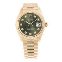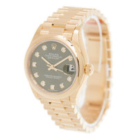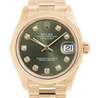 18kt yellow gold case with a 18kt yellow gold rolex president bracelet. Fixed 18kt yellow gold bezel. Olive green dial with gold-tone hands and diamond hour markers. Dial Type: Analog. Date display at the 3 o'clock position. Rolex Calibre 2236 Automatic movement, based upon Rolex 2235, containing 31 Jewels, bitting at 28800 vph, and has a power reserve of approximately 55 hours. Scratch resistant sapphire crystal. Screw down crown. Solid case back. Round case shape. Case size: 31 mm. Water resistant at 100 meters / 330 feet. Functions: date, hour, minute, second. Luxury watch style. Watch label: Swiss Made. Rolex Datejust 31 Olive Green Diamond Dial Automatic Ladies 18kt Yellow Gold President Watch 278248GNDP. INFORMATION Brand: Rolex Series: Datejust Collection Name: Datejust Gender: Womens Model: 278248GNDP Watch Label: Swiss Made Movement: Automatic Engine: Rolex Calibre 2236 CASE Case Size: 31 mm Case Material: 18kt Yellow Gold Case Shape: Round Case Back: Solid BAND Band Material: 18kt Yellow Gold Rolex President Band Type: Bracelet DIAL Dial Color: Olive Green Type: Analog Crystal: Scratch Resistant Sapphire Hands: Gold-tone Dial Markers: Diamond Bezel: Fixed Bezel Material: 18kt Yellow Gold Crown: Screw Down FEATURES Water Resistance: 100 meters / 330 feet Calendar: Date display at the 3 o'clock position Functions: Date, Hour, Minute, Second Watch Features: Diamond, Gold, Analog ADDITIONAL INFO Watch Style: Luxury Warranty: 2 Year Jomashop Warranty Jomashop Sku: RLX278248GNDP Department: Watches Category: Watches