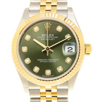Stainless steel and 18kt yellow gold case with a stainless steel and 18kt yellow gold jubilee bracelet. Fixed-fluted bezel. Olive green dial with yellow gold hands and diamond hour markers. Dial Type: Analog. Date display at the 3 o'clock position. Rolex Calibre 2236 automatic movement with a 55-hour power reserve. Scratch resistant sapphire crystal. Screw down crown. Solid case back. Round case shape. Case size: 31 mm. Water resistant at 100 meters / 330 feet. Functions: date, hour, minute, second. Luxury watch style. Watch label: Swiss Made. Rolex Datejust 31 Olive Green Diamond Dial Automatic Ladies Steel and 18kt Yellow Gold Jubilee Watch 278273GNDJ. INFORMATION Brand: Rolex Series: Datejust Collection Name: Datejust Gender: Womens Model: 278273GNDJ Watch Label: Swiss Made Movement: Automatic Engine: Rolex Calibre 2236 Power Reserve: 55 hours CASE Case Size: 31 mm Case Material: Stainless Steel Case Shape: Round Case Back: Solid BAND Band Material: Stainless Steel and 18kt Yellow Gold Jubilee Band Type: Bracelet Band Color: Two-tone (Silver-tone and Yellow Gold-tone) Clasp: Fold Over with Safety Release DIAL Dial Color: Olive Green Type: Analog Crystal: Scratch Resistant Sapphire Hands: Yellow Gold-tone Dial Markers: Diamond Bezel: Fixed-Fluted Bezel Color: Yellow Gold-tone Bezel Material: 18kt Yellow Gold Crown: Screw Down FEATURES Water Resistance: 100 meters / 330 feet Calendar: Date display at the 3 o'clock position Functions: Date, Hour, Minute, Second Watch Features: Diamond, Stainless Steel, Gold, Analog ADDITIONAL INFO Watch Style: Luxury Warranty: 2 Year Jomashop Warranty Jomashop Sku: RLX278273GNDJ Item Variation: M278273-0030 Department: Watches Category: Watches