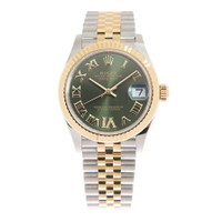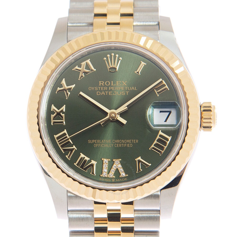 Stainless steel and 18kt yellow gold case with a stainless steel and 18kt yellow gold jubilee bracelet. Fixed bezel. Olive green dial with yellow gold hands and Roman numeral hour markers. Dial Type: Analog. Date display at the 3 o'clock position. Rolex Calibre 2236 automatic movement with a 55-hour power reserve. Scratch resistant sapphire crystal. Screw down crown. Solid case back. Round case shape. Case size: 31 mm. Water resistant at 100 meters / 330 feet. Functions: date, hour, minute, second. Luxury watch style. Watch label: Swiss Made. Rolex Datejust 31 Olive Green Diamond Dial Ladies Automatic Steel and 18kt Yellow Gold Jubilee Watch 278273GNRDJ. INFORMATION Brand: Rolex Series: Datejust Collection Name: Datejust Gender: Womens Model: 278273-0016 Watch Label: Swiss Made Movement: Automatic Engine: Rolex Calibre 2236 Power Reserve: 55 hours CASE Case Size: 31 mm Case Material: Stainless Steel and 18kt Yellow Gold Case Shape: Round Case Back: Solid BAND Band Material: Stainless Steel and 18kt Yellow Gold Jubilee Band Type: Bracelet Band Color: Two-tone (Silver-tone and Gold-tone) DIAL Dial Color: Olive Green Type: Analog Crystal: Scratch Resistant Sapphire Hands: Yellow Gold Dial Markers: Roman Numeral Bezel: Fixed-Fluted Bezel Material: 18kt Yellow Gold Crown: Screw Down FEATURES Water Resistance: 100 meters / 330 feet Calendar: Date display at the 3 o'clock position Functions: Date, Hour, Minute, Second Watch Features: Diamond, Stainless Steel, Gold, Analog ADDITIONAL INFO Watch Style: Luxury Warranty: 2 Year Jomashop Warranty Jomashop Sku: RLX278273GNRDJ Department: Watches Category: Watches