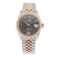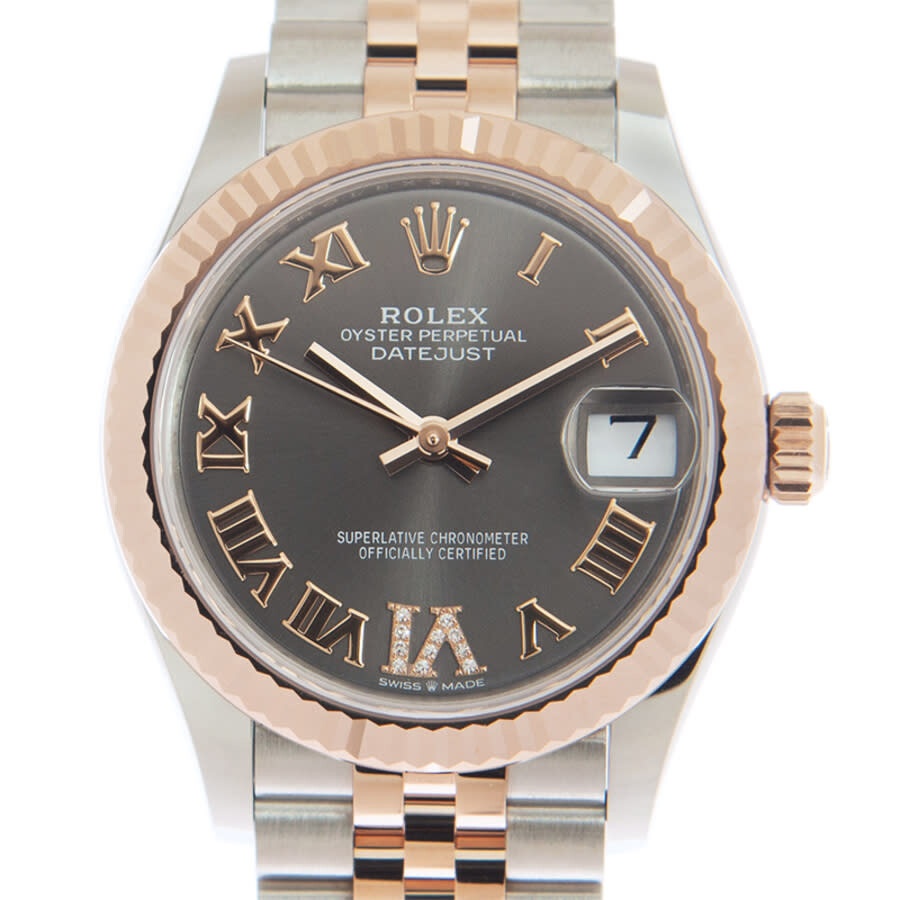 Stainless steel case with a stainless steel jubilee bracelet with 18kt everose gold center links. Fixed fluted 18kt everose gold bezel. Rhodium dial with everose gold hands and Roman numeral hour markers. Dial Type: Analog. Date display at the 3 o'clock position. Rolex calibre 2236 automatic movement, based upon Rolex 2235, containing 31 Jewels, bitting at 28800 vph, and has a power reserve of approximately 55 hours. Scratch resistant sapphire crystal. Screw down crown. Solid case back. Round case shape. Case size: 31 mm. Fold over clasp. Water resistant at 100 meters / 330 feet. Functions: date, hour, minute, second. Datejust 31 Series. Luxury watch style. Watch label: Swiss Made. Rolex Datejust 31 Rhodium Diamond Dial Automatic Ladies Steel and 18kt Everose Gold Jubilee Watch 278271DRRDJ. INFORMATION Brand: Rolex Series: Datejust Collection Name: Datejust Gender: Womens Model: 278271DRRDJ Watch Label: Swiss Made Movement: Automatic Engine: Rolex Calibre 2236 Power Reserve: 55 hours CASE Case Size: 31 mm Case Material: Stainless Steel Case Shape: Round Case Back: Solid BAND Band Material: Stainless Steel and 18kt Everose Gold Jubilee Band Type: Bracelet Band Color: Silver-tone Clasp: Fold Over DIAL Dial Color: Rhodium Type: Analog Crystal: Scratch Resistant Sapphire Hands: Everose Gold Dial Markers: Roman Numeral Bezel: Fixed Fluted Bezel Color: Rose Gold-tone Bezel Material: 18kt Everose Gold Crown: Screw Down FEATURES Water Resistance: 100 meters / 330 feet Calendar: Date display at the 3 o'clock position Functions: Date, Hour, Minute, Second Watch Features: Diamond, Stainless Steel, Gold, Analog ADDITIONAL INFO Watch Style: Luxury Warranty: 2 Year Jomashop Warranty Jomashop Sku: RLX278271DRRDJ Department: Watches Category: Watches