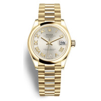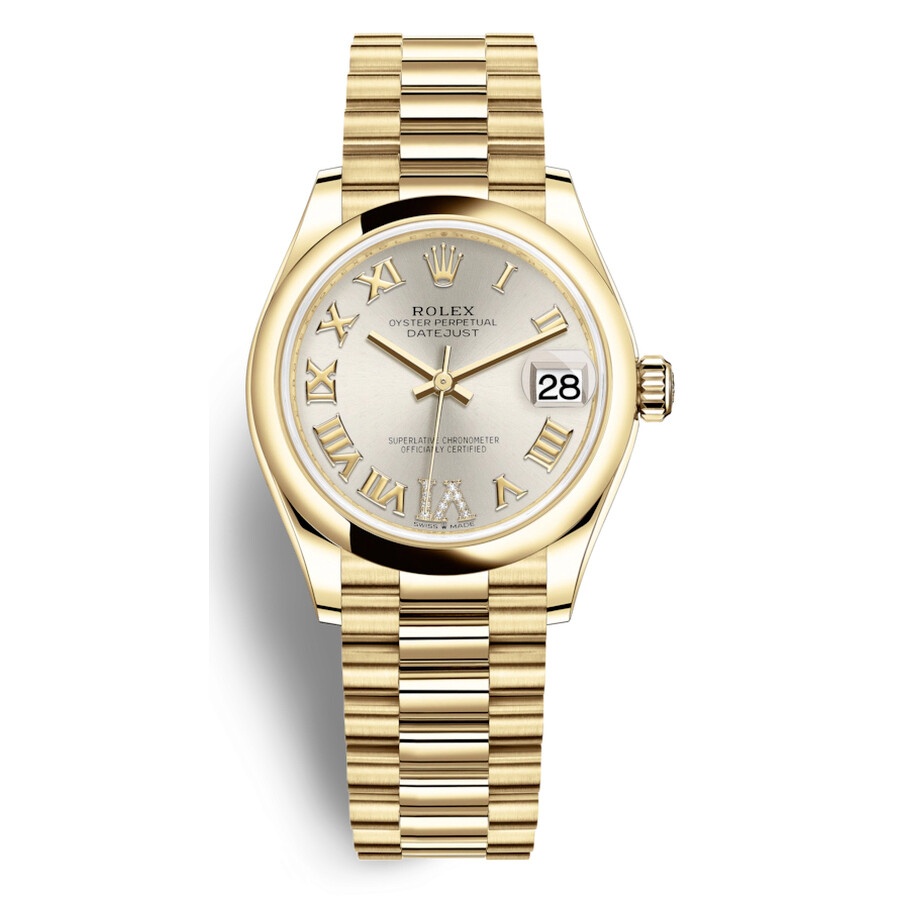 18kt yellow gold case with a 18kt yellow gold rolex president bracelet. Fixed 18kt yellow gold bezel. Silver dial with silver-tone hands and Roman- diamond numeral hour markers. Dial Type: Analog. Date display at the 3 o'clock position. Rolex Calibre 2236 Automatic movement, based upon Rolex 2235, containing 31 Jewels, bitting at 28800 vph, and has a power reserve of approximately 55 hours. Scratch resistant sapphire crystal. Screw down crown. Solid case back. Round case shape. Case size: 31 mm. Water resistant at 100 meters / 330 feet. Functions: date, hour, minute, second. Luxury watch style. Watch label: Swiss Made. Rolex Datejust 31 Silver Dial Automatic Ladies 18kt Yellow Gold President Watch 278248SRDP. INFORMATION Brand: Rolex Series: Datejust Collection Name: Datejust Gender: Womens Model: 278248SRDP Watch Label: Swiss Made Movement: Automatic Engine: Rolex Calibre 2236 CASE Case Size: 31 mm Case Material: 18kt Yellow Gold Case Shape: Round Case Back: Solid BAND Band Material: 18kt Yellow Gold Rolex President Band Type: Bracelet DIAL Dial Color: Silver Type: Analog Crystal: Scratch Resistant Sapphire Hands: Silver-tone Dial Markers: Roman- Diamond Numeral Bezel: Fixed Bezel Material: 18kt Yellow Gold Crown: Screw Down FEATURES Water Resistance: 100 meters / 330 feet Calendar: Date display at the 3 o'clock position Functions: Date, Hour, Minute, Second Watch Features: Diamond, Gold, Analog ADDITIONAL INFO Watch Style: Luxury Warranty: 2 Year Jomashop Warranty Jomashop Sku: RLX278248SRDP Department: Watches Category: Watches