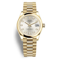 18kt yellow gold case with a 18kt yellow gold rolex president bracelet. Fixed 18kt yellow gold bezel. Silver dial with gold-tone hands and diamond hour markers. Dial Type: Analog. Date display at the 3 o'clock position. Rolex Calibre 2236 Automatic movement, based upon Rolex 2235, containing 31 Jewels, bitting at 28800 vph, and has a power reserve of approximately 55 hours. Scratch resistant sapphire crystal. Screw down crown. Solid case back. Round case shape. Case size: 31 mm. Water resistant at 100 meters / 330 feet. Functions: date, hour, minute, second. Luxury watch style. Watch label: Swiss Made. Rolex Datejust 31 Silver Diamond Dial Automatic Ladies 18kt Yellow Gold Oyster Watch 278248SDP. INFORMATION Brand: Rolex Series: Datejust Collection Name: Datejust Gender: Womens Model: 278248SDP Watch Label: Swiss Made Movement: Automatic Engine: Rolex Calibre 2236 CASE Case Size: 31 mm Case Material: 18kt Yellow Gold Case Shape: Round Case Back: Solid BAND Band Material: 18kt Yellow Gold Rolex President Band Type: Bracelet DIAL Dial Color: Silver Type: Analog Crystal: Scratch Resistant Sapphire Hands: Gold-tone Dial Markers: Diamond Bezel: Fixed Bezel Material: 18kt Yellow Gold Crown: Screw Down FEATURES Water Resistance: 100 meters / 330 feet Calendar: Date display at the 3 o'clock position Functions: Date, Hour, Minute, Second Watch Features: Diamond, Gold, Analog ADDITIONAL INFO Watch Style: Luxury Warranty: 2 Year Jomashop Warranty Jomashop Sku: RLX278248SDP Department: Watches Category: Watches