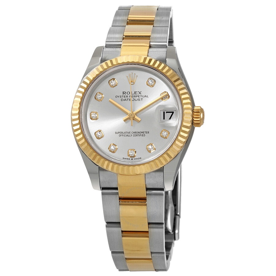 Stainless steel case with a stainless steel oyster bracelet with 18kt yellow gold center links. Fixed fluted 18kt yellow gold bezel. Silver dial with yellow gold hands and diamond hour markers. Minute markers around the outer rim. Dial Type: Analog. Date display at the 3 o'clock position. Rolex calibre 2236 automatic movement, based upon Rolex 2235, containing 31 Jewels, bitting at 28800 vph, and has a power reserve of approximately 55 hours. Scratch resistant sapphire crystal. Screw down crown. Solid case back. Round case shape. Case size: 31 mm. Fold over clasp. Water resistant at 100 meters / 330 feet. Functions: date, hour, minute, second. Datejust 31 Series. Luxury watch style. Watch label: Swiss Made. Rolex Datejust 31 Silver Diamond Dial Automatic Ladies Steel and 18kt Yellow Gold Oyster Watch 278273SDO. INFORMATION Brand: Rolex Series: Datejust Collection Name: Datejust Gender: Womens Model: 278273SDO Watch Label: Swiss Made Movement: Automatic Engine: Rolex Calibre 2236 Power Reserve: 55 hours CASE Case Size: 31 mm Case Material: Stainless Steel Case Shape: Round Case Back: Solid BAND Band Material: Stainless Steel with 18kt Yellow Gold Oyster Band Type: Bracelet Band Color: Silver-tone Clasp: Fold Over DIAL Dial Color: Silver Type: Analog Crystal: Scratch Resistant Sapphire Hands: Yellow Gold Dial Markers: Diamond Second Markers: Minute Markers around the outer rim Bezel: Fixed Fluted Bezel Material: 18kt Yellow Gold Crown: Screw Down FEATURES Water Resistance: 100 meters / 330 feet Calendar: Date display at the 3 o'clock position Functions: Date, Hour, Minute, Second Watch Features: Diamond, Stainless Steel, Gold, Analog ADDITIONAL INFO Watch Style: Luxury Warranty: 2 Year Jomashop Warranty Jomashop Sku: RLX278273SDO Department: Watches Category: Watches
