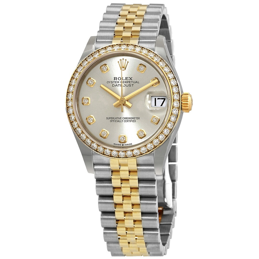 Stainless steel case with a stainless steel Rolex jubilee bracelet with 18kt yellow gold center links. Fixed 18kt yellow gold bezel set with diamonds. Silver dial with yellow gold hands and diamond hour markers. Dial Type: Analog. Date display at the 3 o'clock position. Rolex calibre 2236 automatic movement, based upon Rolex 2235, containing 31 Jewels, bitting at 28800 vph, and has a power reserve of approximately 55 hours. Scratch resistant sapphire crystal. Screw down crown. Solid case back. Round case shape. Case size: 31 mm. Oyster clasp. Water resistant at 100 meters / 330 feet. Functions: date, hour, minute, second. Datejust 31 Series. Luxury watch style. Watch label: Swiss Made. Rolex Datejust 31 Silver Diamond Dial Ladies Steel and 18kt Yellow Gold Jubilee Watch 278383SDJ. INFORMATION Brand: Rolex Series: Datejust Collection Name: Datejust Gender: Womens Model: 278383SDJ Watch Label: Swiss Made Movement: Automatic Engine: Rolex Calibre 2236 Power Reserve: 55 hours CASE Case Size: 31 mm Case Material: Stainless Steel Case Shape: Round Case Back: Solid BAND Band Material: Stainless Steel and 18kt Yellow Gold Jubilee Band Type: Bracelet Clasp: Oyster DIAL Dial Color: Silver Type: Analog Crystal: Scratch Resistant Sapphire Hands: Yellow Gold Dial Markers: Diamond Bezel: Fixed Bezel Material: 18kt Yellow Gold set with Diamonds Crown: Screw Down FEATURES Water Resistance: 100 meters / 330 feet Calendar: Date display at the 3 o'clock position Functions: Date, Hour, Minute, Second Watch Features: Diamond, Stainless Steel, Gold, Analog ADDITIONAL INFO Watch Style: Luxury Warranty: 2 Year Jomashop Warranty UPC Code: 842047186657 Jomashop Sku: RLX278383SDJ Department: Watches Category: Watches