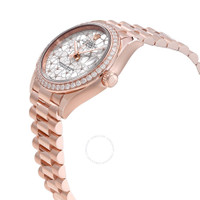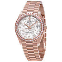 18kt everose gold case with a 18kt everose gold president bracelet. Fixed, fluted 18kt everose gold bezel. Silver floral motif dial with everose gold hands. Dial Type: Analog. Date display at the 3 o'clock position. Rolex Calibre 2236 Automatic movement, based upon Rolex 2235, containing 31 Jewels, bitting at 28800 vph, and has a power reserve of approximately 55 hours. Scratch resistant sapphire crystal. Screw down crown. Solid case back. Round case shape, case size: 31 mm. Concealed folding crown clasp. Water resistant at 100 meters / 330 feet. Functions: date, hour, minute, second. Additional Info: dial set with 24 diamonds in 18 ct gold settings. Datejust 31 Series. Luxury watch style. Watch label: Swiss Made. Rolex Datejust 31 Silver Floral Motif Diamond Dial Ladies 18kt Everose Gold President Watch M278285rbr-0036. INFORMATION Brand: Rolex Series: Datejust Collection Name: Datejust Gender: Womens Model: M278285rbr-0036 Watch Label: Swiss Made Movement: Automatic Engine: Rolex Calibre 2236 Power Reserve: 55 hours CASE Case Size: 31 mm Case Material: 18kt Everose Gold Case Shape: Round Case Back: Solid BAND Band Material: 18kt Everose Gold President Band Type: Bracelet Clasp: Concealed folding Crownclasp DIAL Dial Color: Silver Floral Motif Type: Analog Crystal: Scratch Resistant Sapphire Hands: Everose Gold Bezel: Fixed, Fluted Bezel Material: 18kt Everose Gold Crown: Screw Down FEATURES Water Resistance: 100 meters / 330 feet Calendar: Date display at the 3 o'clock position Functions: Date, Hour, Minute, Second Watch Features: Diamond, Gold, Analog ADDITIONAL INFO Watch Style: Luxury Warranty: 2 Year Jomashop Warranty Additional Info: dial set with 24 diamonds in 18 ct gold settings Jomashop Sku: RLX278285RBR-0036 Item Variation: 278285rbr-0036 Department: Watches Category: Watches