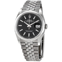 Stainless steel case with a stainless steel Rolex jubilee bracelet. Fixed domed stainless steel bezel. Black dial with luminous silver-tone hands and index hour markers. Minute markers around the outer rim. Dial Type: Analog. Luminescent hands and markers. Date display at the 3 o'clock position. Rolex calibre 3235 automatic movement, based upon Rolex 3035, containing 31 Jewels, bitting at 28800 vph, and has a power reserve of approximately 70 hours. Scratch resistant sapphire crystal. Screw down crown. Solid case back. Round case shape. Case size: 36 mm. Fold over oyster clasp. Water resistant at 100 meters / 330 feet. Functions: date, hour, minute, second, chronometer. Datejust 36 Series. Luxury watch style. Watch label: Swiss Made. Rolex Datejust 36 Automatic Black Dial Men's Jubilee Watch 126200BKSJ. CASE Case Size: 36 Case Color: Silver-Tone Case Material: Stainless Steel Case Shape: Round Case Back: Solid BAND Band Material: Stainless Steel Rolex Jubilee Band Type: Bracelet Band Color: Silver-tone Clasp: Fold Over Oyster DIAL Dial Color: Black Type: Analog Crystal: Scratch Resistant Sapphire Hands: Luminous Silver-tone Dial Markers: Index Second Markers: Minute Markers around the outer rim Luminiscence: Hands and Markers Bezel: Fixed Domed Bezel Color: Silver-tone Bezel Material: Stainless Steel Crown: Screw Down INFORMATION Brand: Rolex Series: Datejust Collection Name: Datejust Gender: Mens Model: 126200BKSJ Watch Label: Swiss Made Movement: Automatic Engine: Rolex Calibre 3235 Power Reserve: 70 hours FEATURES Water Resistance: 100 meters / 330 feet Calendar: Date display at the 3 o'clock position Functions: Date, Hour, Minute, Second, Chronometer Watch Features: Stainless Steel, Chronometer, Analog ADDITIONAL INFO Watch Style: Luxury Warranty: 2 Year Jomashop Warranty Jomashop Sku: RLX126200BKSJ Item Variation: M126200-0003, 126200-0003 Department: Watches Category: Watches