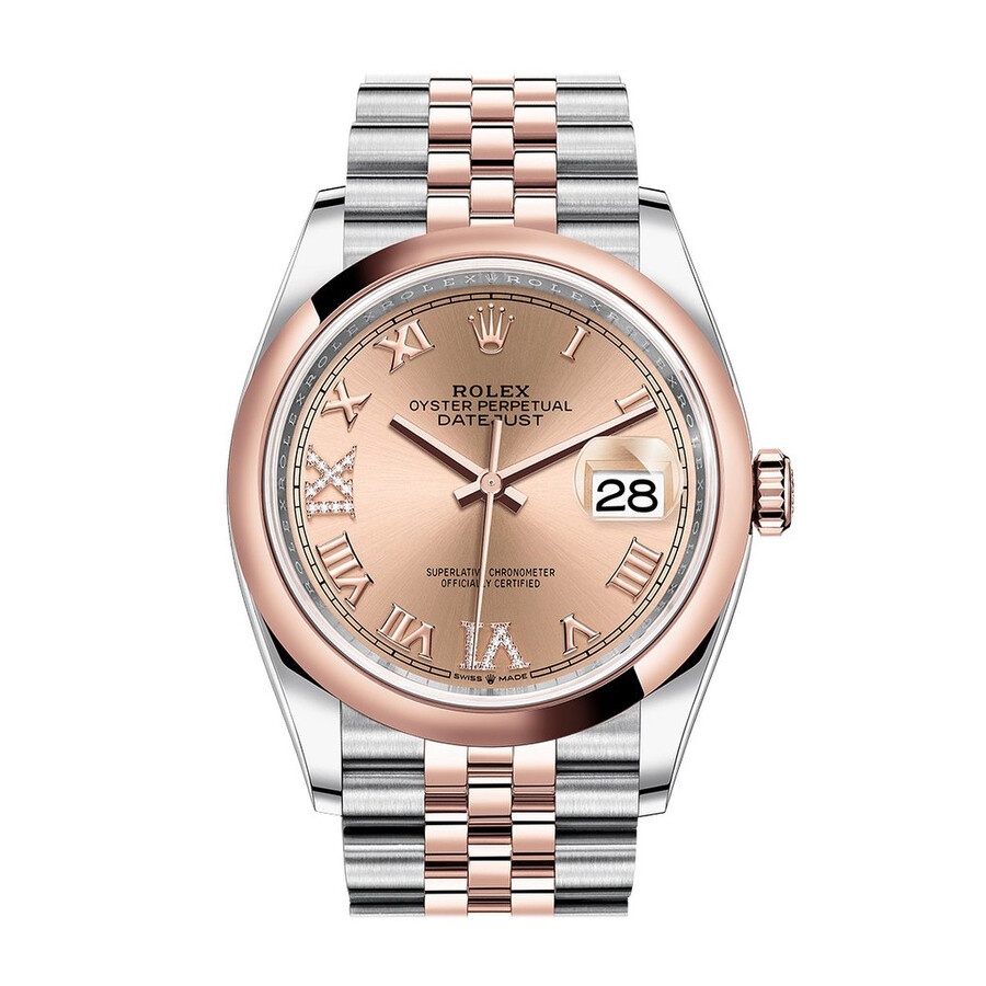 Stainless steel and 18k everose gold case with a stainless steel and 18k everose gold rolex jubilee bracelet. Fixed bezel. Pink dial with everose gold hands and Roman numeral hour markers. Dial Type: Analog. Date display at the 3 o'clock position. Rolex Calibre 3235 automatic movement with a 70-hour power reserve. Scratch resistant sapphire crystal. Screw down crown. Solid case back. Round case shape. Case size: 36 mm. Water resistant at 100 meters / 330 feet. Functions: date, hour, minute, second. Luxury watch style. Watch label: Swiss Made. Rolex Datejust 36 Automatic Pink Diamond Dial Men's Steel and 18K Everose Gold Jubilee Watch 126201PKRDJ. CASE Case Size: 36 Case Material: Stainless Steel and 18kt Everose Gold Case Shape: Round Case Back: Solid BAND Band Material: Stainless Steel and 18K Everose Gold Rolex Jubilee Band Type: Bracelet Band Color: Two-tone (Silver-tone and Rose Gold-tone) DIAL Dial Color: Pink Type: Analog Crystal: Scratch Resistant Sapphire Hands: Everose Gold Dial Markers: Roman Numeral Bezel: Fixed Bezel Material: 18kt Everose Gold Crown: Screw Down INFORMATION Brand: Rolex Series: Datejust Collection Name: Datejust Gender: Mens Model: 126201PKRDJ Watch Label: Swiss Made Movement: Automatic Engine: Rolex Calibre 3235 Power Reserve: 70 hours FEATURES Water Resistance: 100 meters / 330 feet Calendar: Date display at the 3 o'clock position Functions: Date, Hour, Minute, Second Watch Features: Diamond, Stainless Steel, Gold, Analog ADDITIONAL INFO Watch Style: Luxury Warranty: 2 Year Jomashop Warranty Jomashop Sku: RLX126201PKRDJ Department: Watches Category: Watches