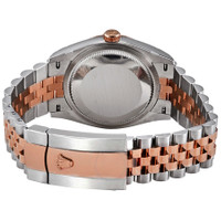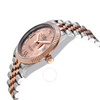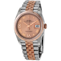 Stainless steel and 18kt everose gold case with a two-tone (silver-tone and rose gold-tone) stainless steel and 18kt everose gold jubilee bracelet. Fixed fluted 18kt everose gold bezel. Pink dial with everose gold hands and Roman numeral hour markers. Minute markers around the outer rim. Dial Type: Analog. Date display at the 3 o'clock position. Rolex Calibre 3235 automatic movement with a 70-hour power reserve. Scratch resistant sapphire crystal. Screw down crown. Solid case back. Round case shape. Case size: 36 mm. Oyster clasp. Water resistant at 100 meters / 330 feet. Functions: date, hour, minute, second, chronometer. Luxury watch style. Watch label: Swiss Made. Rolex Datejust 36 Automatic Pink Diamond Dial Men's Steel and 18kt Everose Gold Jubilee Watch 126231PKRDJ. CASE Case Size: 36 Case Material: Stainless Steel and 18kt Everose Gold Case Shape: Round Case Back: Solid BAND Band Material: Stainless Steel and 18kt Everose Gold Jubilee Band Type: Bracelet Band Color: Two-tone (Silver-tone and Rose Gold-tone) Clasp: Oysterclasp DIAL Dial Color: Pink Type: Analog Crystal: Scratch Resistant Sapphire Hands: Everose Gold Dial Markers: Roman Numeral Second Markers: Minute Markers around the outer rim Bezel: Fixed Fluted Bezel Material: 18kt Everose Gold Crown: Screw Down INFORMATION Brand: Rolex Series: Datejust Collection Name: Datejust Gender: Mens Model: 126231 Watch Label: Swiss Made Movement: Automatic Engine: Rolex Calibre 3235 Power Reserve: 70 hours FEATURES Water Resistance: 100 meters / 330 feet Calendar: Date display at the 3 o'clock position Functions: Date, Hour, Minute, Second, Chronometer Watch Features: Diamond, Stainless Steel, Gold, Chronometer, Analog ADDITIONAL INFO Watch Style: Luxury Warranty: 2 Year Jomashop Warranty Jomashop Sku: RLX126231PKRDJ Department: Watches Category: Watches